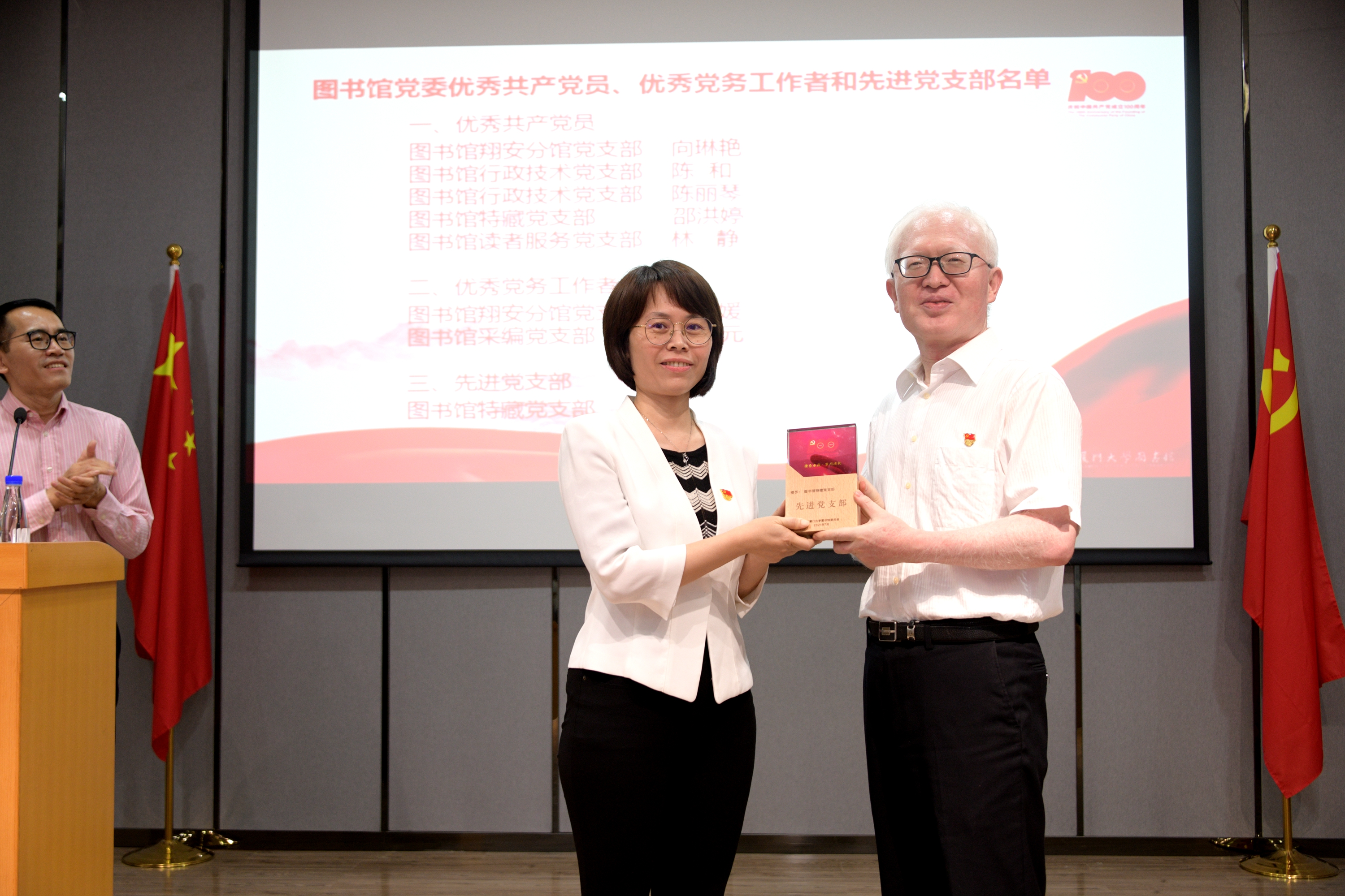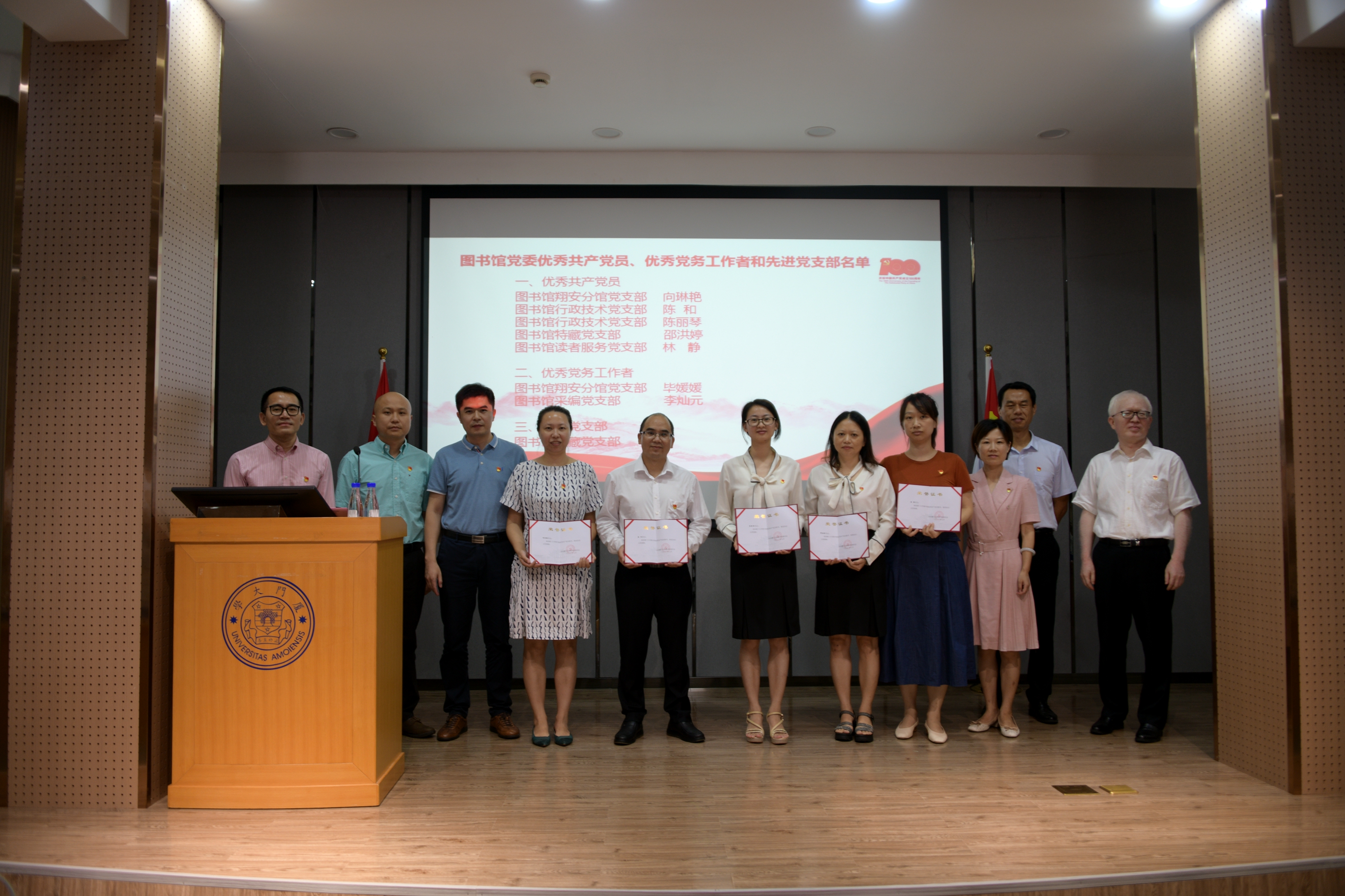 纪念章颁发仪式结束后,陈滨书记宣读《关于表彰图书馆优秀共产党员、优秀党务工作者和先进党支部的决定》,并向各位获奖者颁发了荣誉证书。其中,戴鹭涛荣获厦门大学优秀共产党员,向琳艳、陈丽琴、陈和、邵红婷、林静五位同志荣获厦门大学图书馆优秀共产党员,毕媛媛、李灿元荣获厦门大学图书馆优秀党务工作者,特藏党支部荣获厦门大学图书馆先进党支部。