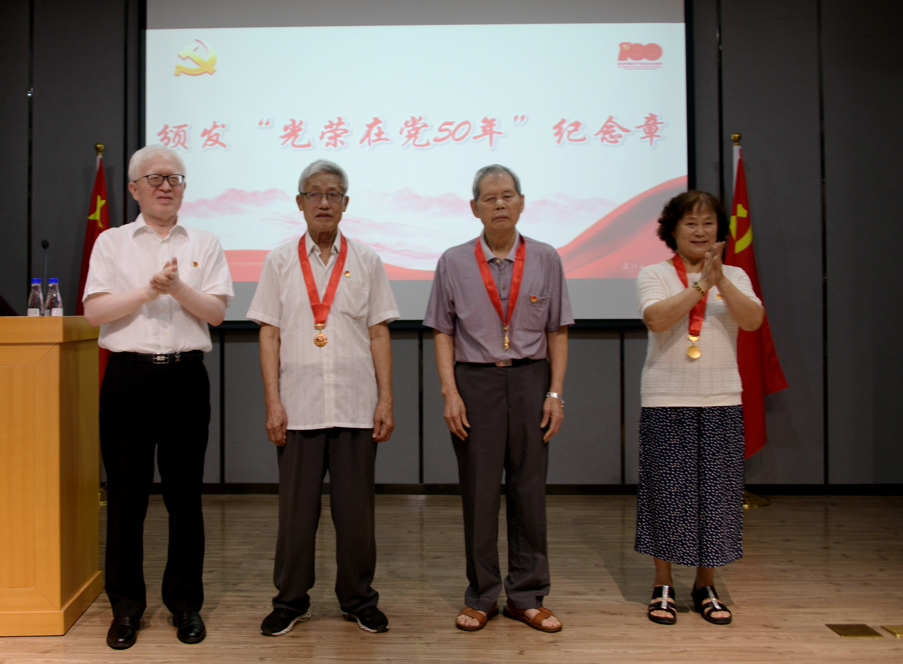 “光荣在党50年”纪念章是党中央2021年首次颁发的纪念章,颁发对象是截至2021年7月1日党龄达到50周年、一贯表现良好的党员,图书馆共有7名同志获此殊荣,分别是吴广、陈淑女、王忠俊、朱立文、蔡淑珠、洪群滴、郑瑞龙。