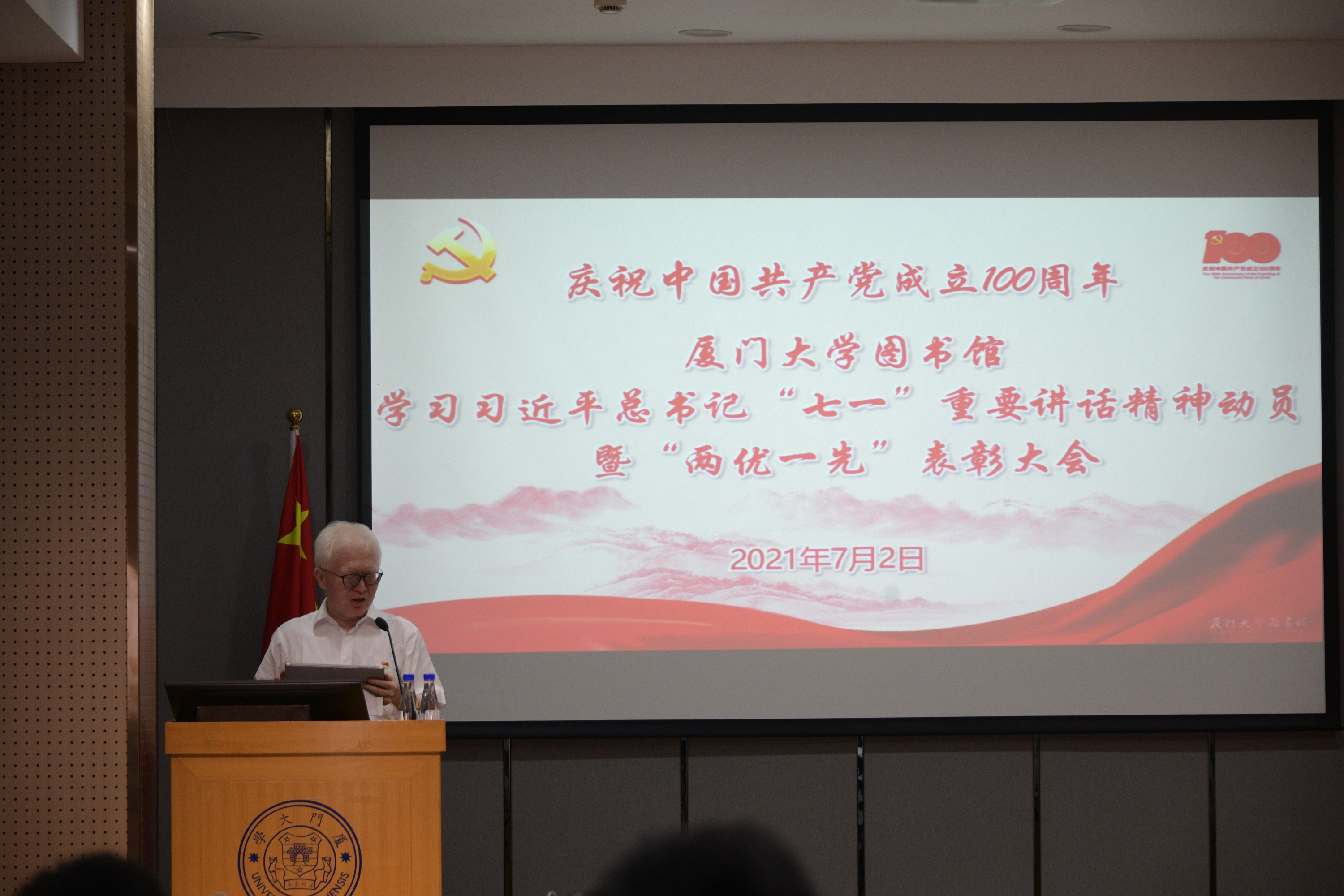 7月2日下午,在“光荣在党50年”纪念章颁发仪式及“两优一先”表彰大会结束后,陈滨书记又向全体党员发表动员讲话,就进一步开展学习习近平总书记“七一”重要讲话精神进行动员和部署。陈滨在讲话中指出,根据学校统一部署,党史学习教育进入了以学习习近平总书记“七一”重要讲话精神为重点的阶段,全体党员要把握关键节点,以学习宣传贯彻习近平总书记“七一”重要讲话精神为契机,紧扣图书馆发展使命,提高政治站位,强化一流标准,凝聚奋进力量,用重要讲话精神指引一流图书馆建设,全面推进党史学习教育取得新的成效。