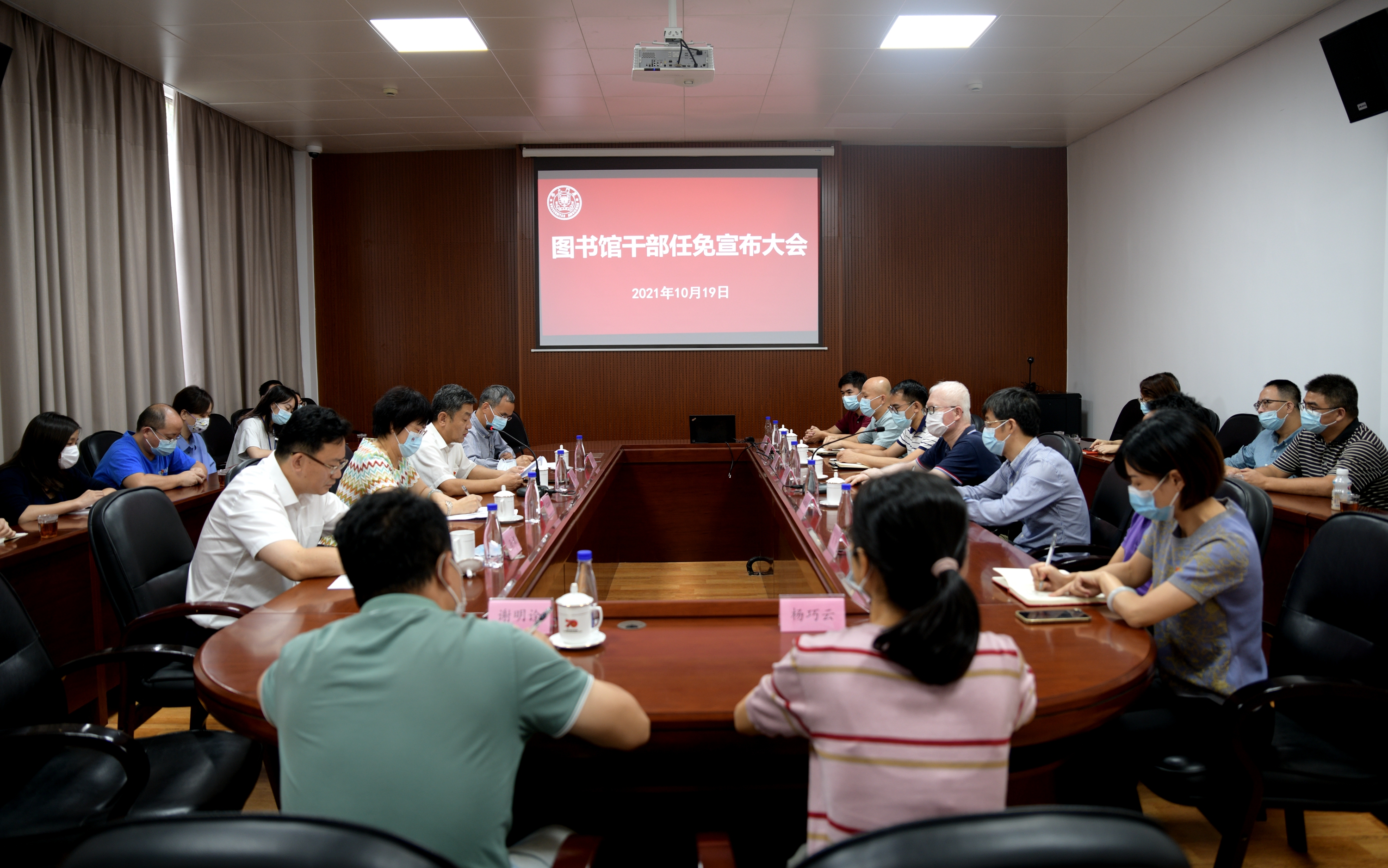 10月19日下午,校党委在图书馆总馆一楼会议室召开图书馆干部任免宣布大会。校党委副书记、纪委书记全海、校党委常委、副校长邓朝晖、图书馆党政领导班子成员、党委委员、部门负责人、科级以上干部、教工党支部书记、支部委员等参加了会议。会议由校党委常委、组织部部长、统战部部长孙理同志主持。