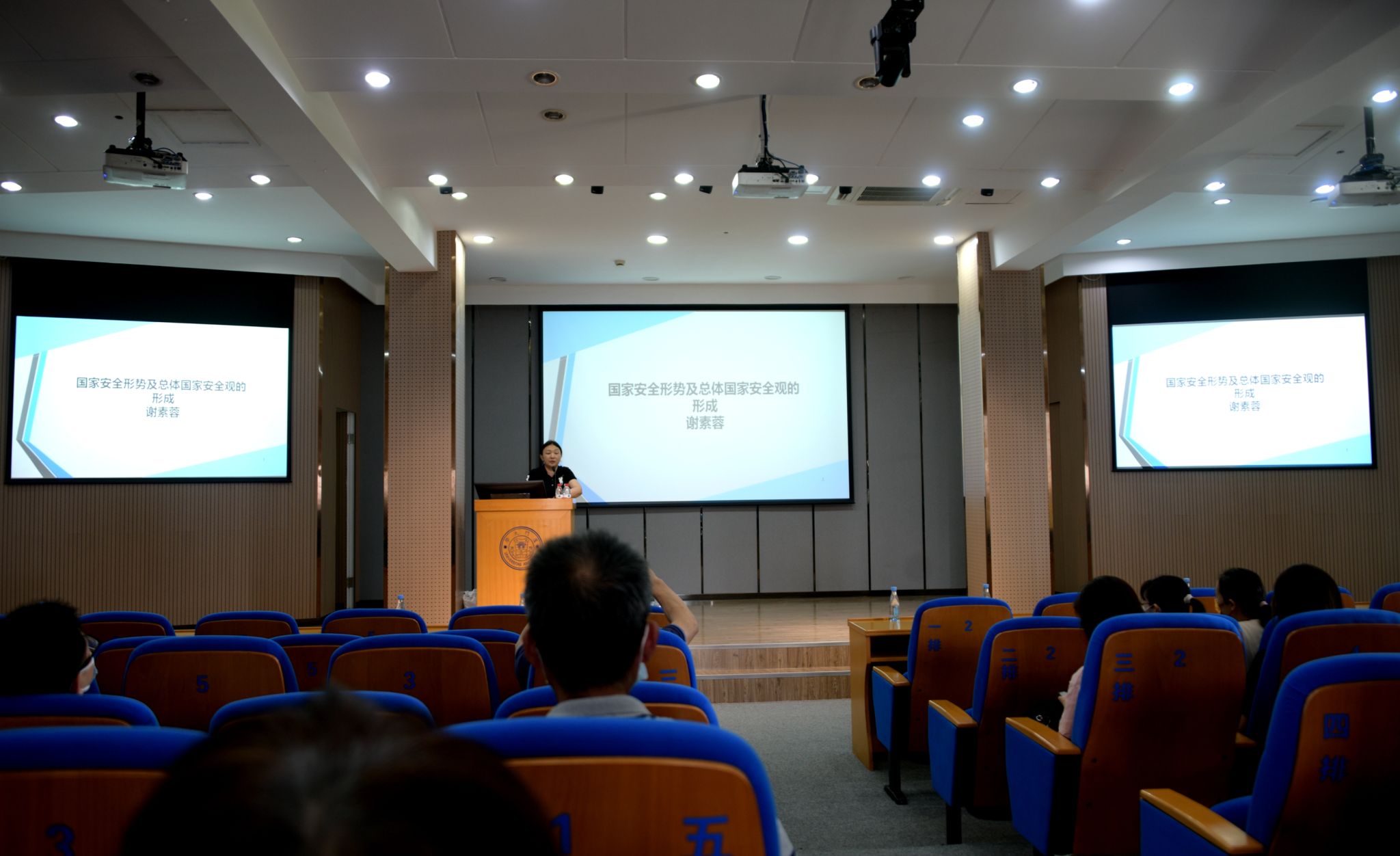 谢素蓉副教授以《国家安全形势及总体国家安全观的形成》为题,结合当前国际形势和热点问题剖析了国家安全形势,深刻阐述了总体国家安全观的形成发展、科学内涵和精神实质,并就如何贯彻落实总体国家安全观提出了具体要求。