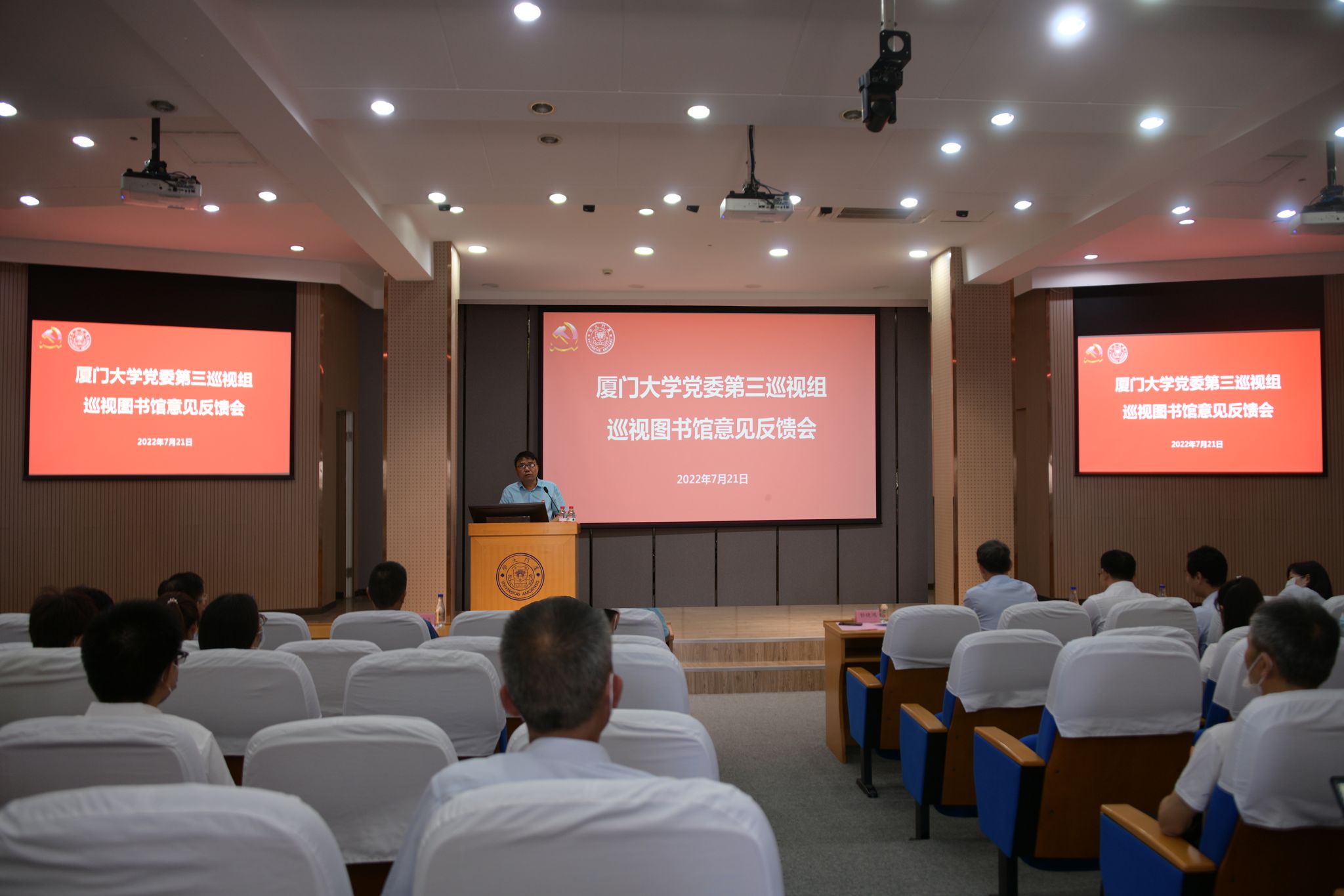 7月21日下午,校党委第三巡视组巡视图书馆意见反馈会在图书馆5楼报告厅召开。校党委第三巡视组组长蔡郑伟、副组长杨鸿飞,纪检监察机构代表校纪委副书记黄宝秋,巡视办副主任洪真裁,组织部门代表组织部副部长曲延云出席会议。会议由图书馆党委副书记、馆长钞晓鸿主持,图书馆领导班子成员和在职教职工参加了会议。
