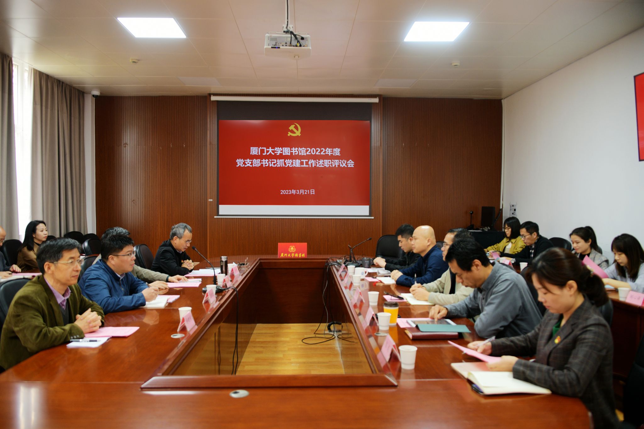 为进一步压实基层党组织书记抓基层党建第一责任人职责,推动全面从严治党向基层延伸,提升基层党建工作质量,2023年3月21日上午,图书馆2022年度党支部书记抓党建工作述职评议会在总馆一楼会议室召开。学校基层党建工作联络员郑建华、校党委组织员兼党建办副主任葛郝锐莅会指导,馆领导、党支部书记和党员代表参加本次述职评议会。会议由党委书记侯利标同志主持。