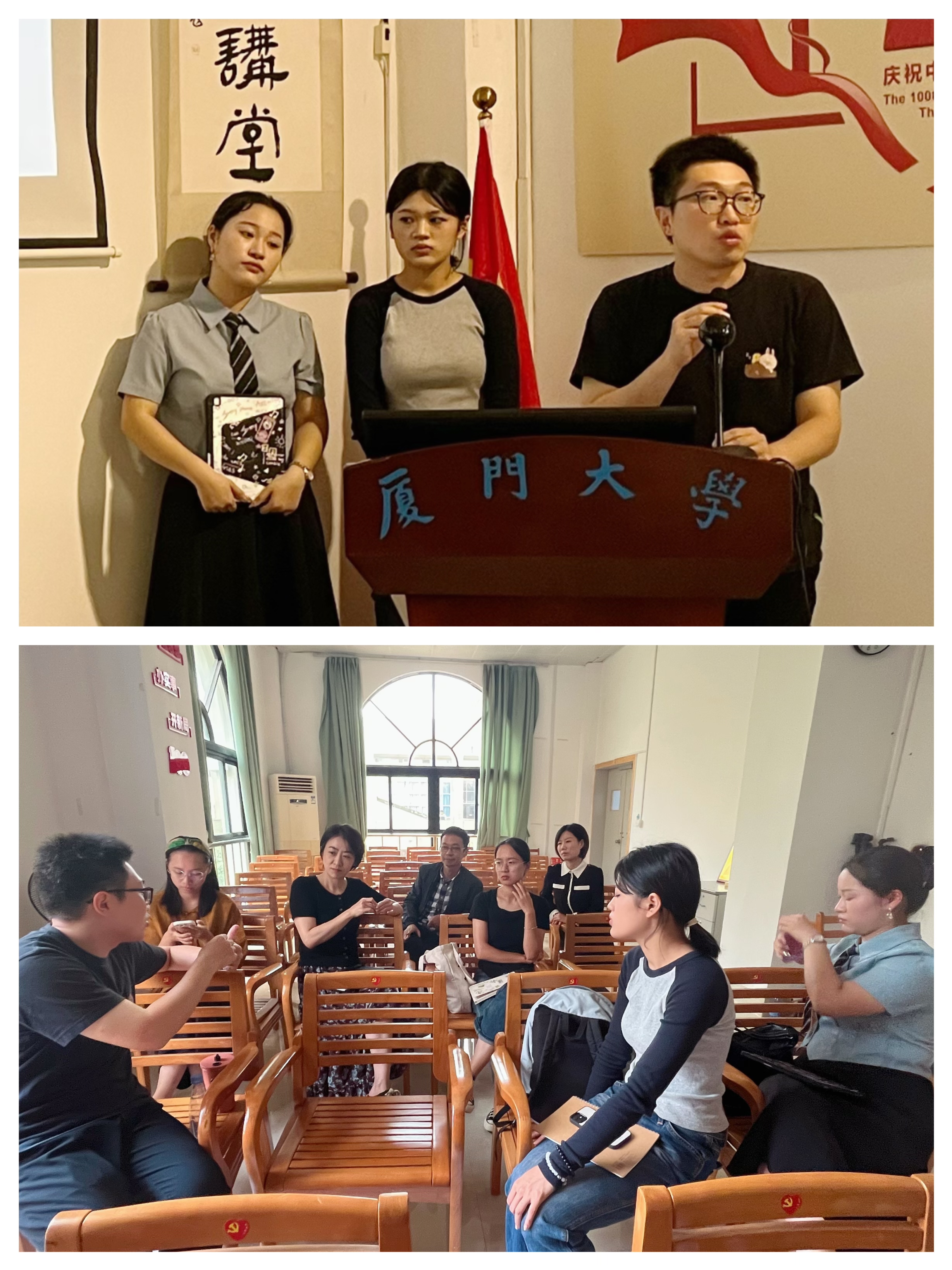 林则全老师带来《图书信息设计及工作坊设想与探讨》的报告。他和团队成员李佩锦、林雅歆同学一起,从图书信息设计和艺术的双重视角,对图书馆每年产生的大量闲置书封的处置方式进行了探索性研究,提出了图书信息设计新思路和书封拼贴创意工作坊计划,助力激发用户创意思维,促进跨学科融合及图书馆可持续发展。参会馆员就图书馆年度报告可视化、主题图书信息设计、图书馆空间导航设计、“停靠站”书封拼贴工作坊实施计划等具体问题与林则全老师团队展开热烈讨论。