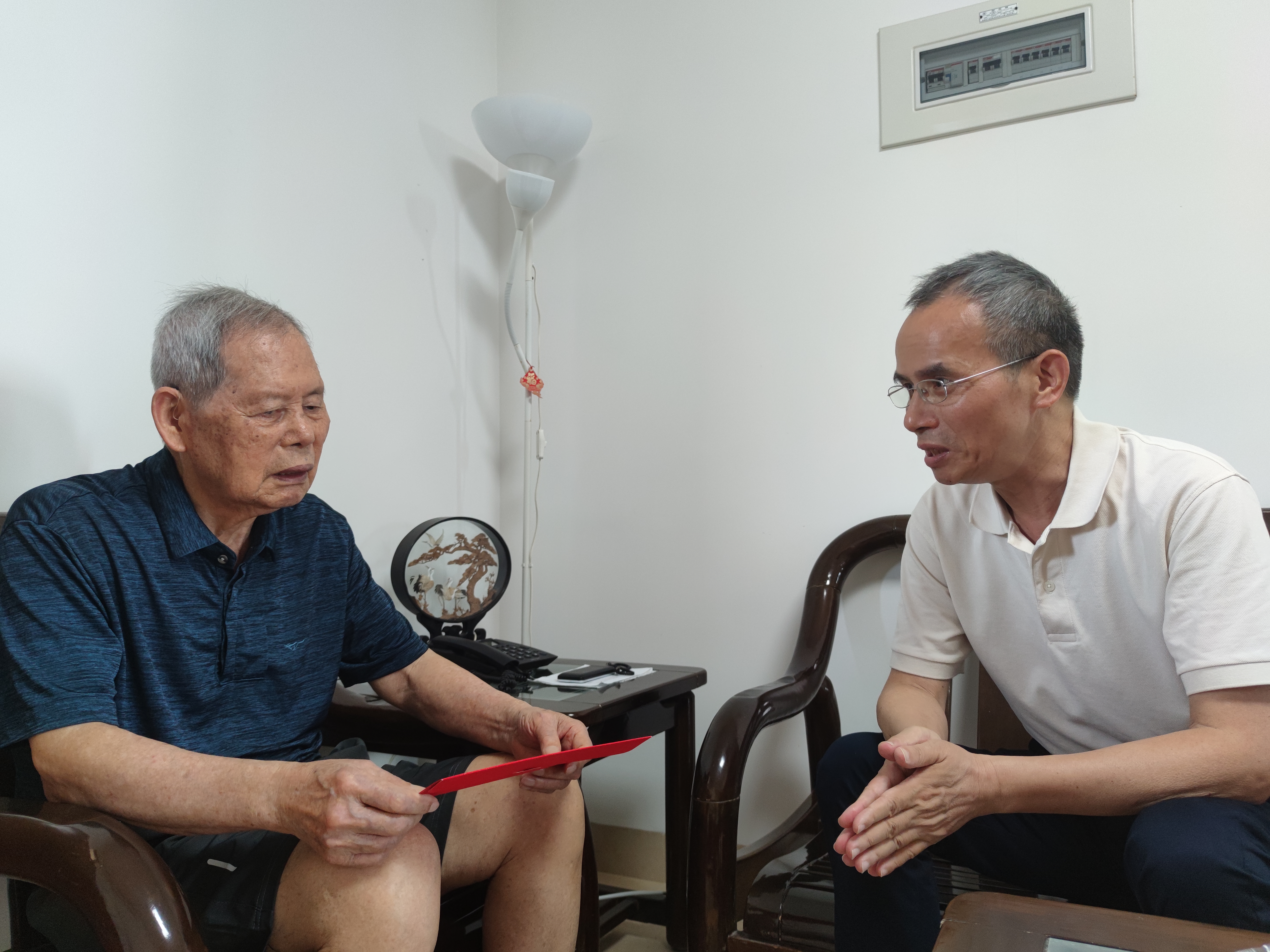 随后,一行人来到海韵北区朱立文同志家中,侯利标与之进行了亲切而深入的交谈,详细了解朱立文的健康情况和家庭状况,叮嘱他保重身体,有困难要及时向组织反映。
