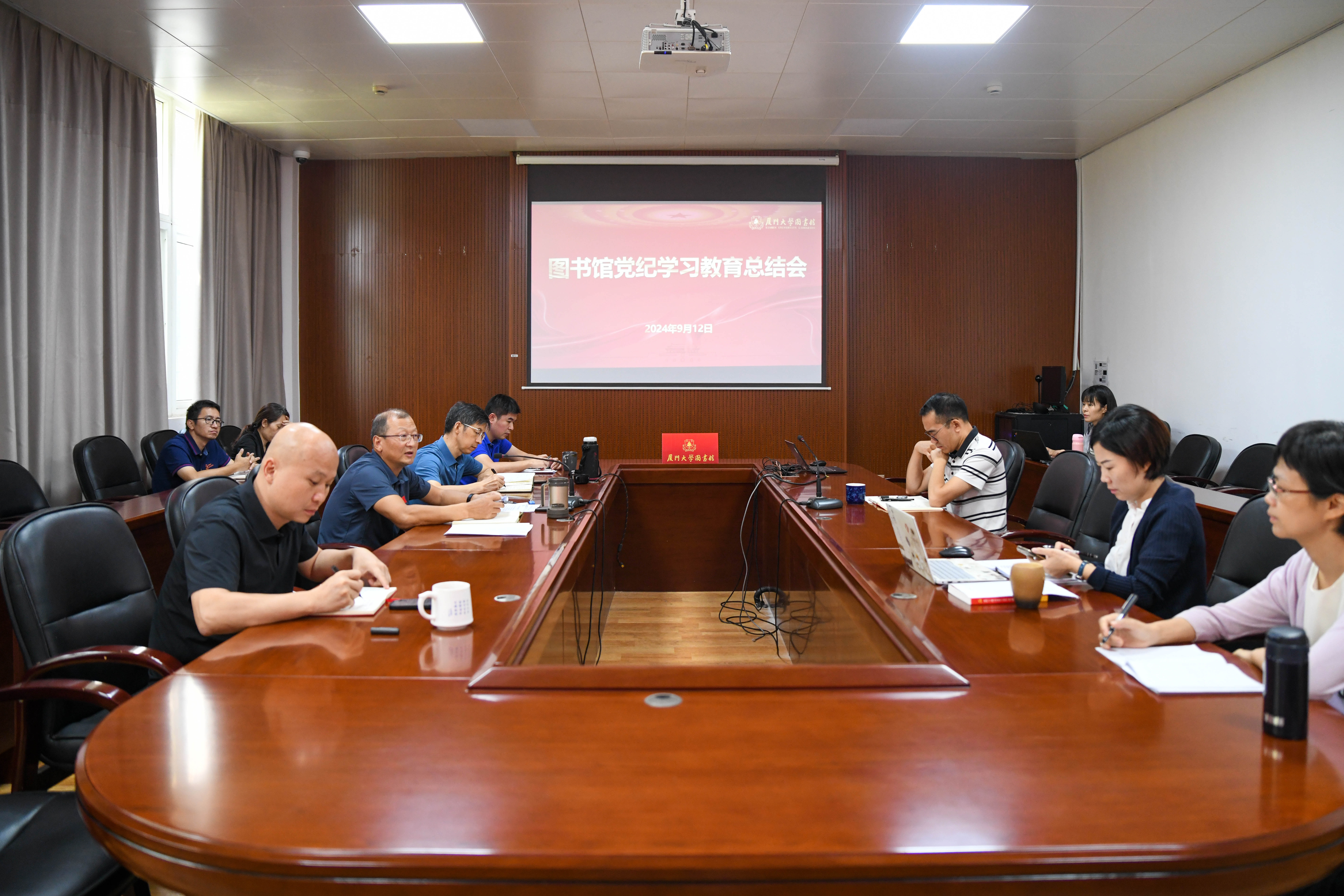 2024年9月12日上午,图书馆党委在总馆一楼会议室召开党纪学习教育总结会。图书馆领导班子成员、党委委员、党支部书记参加会议,会议由馆党委书记杜海林主持。