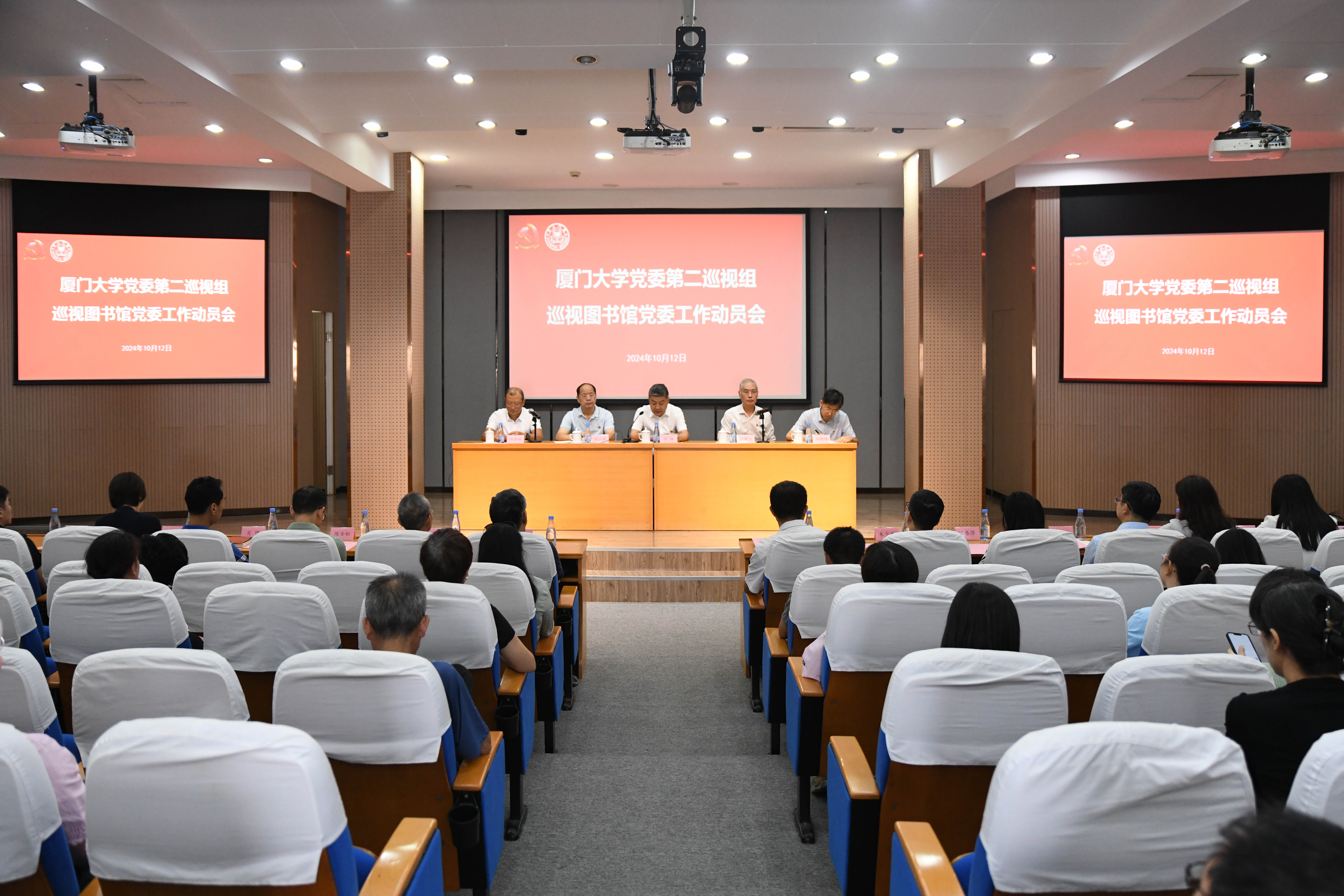 根据学校党委统一部署,2024年10月12日上午,校党委第二巡视组巡视图书馆党委工作动员大会在图书馆5楼报告厅召开。校党委副书记、纪委书记、国家监委驻厦门大学监察专员全海,第二巡视组组长叶鹏飞、副组长刘立荣,党委巡视办主任洪真裁,巡视组全体成员出席动员会。图书馆领导班子成员、全体在职教职工和离退休同志代表参加会议。会议由图书馆党委书记杜海林主持。