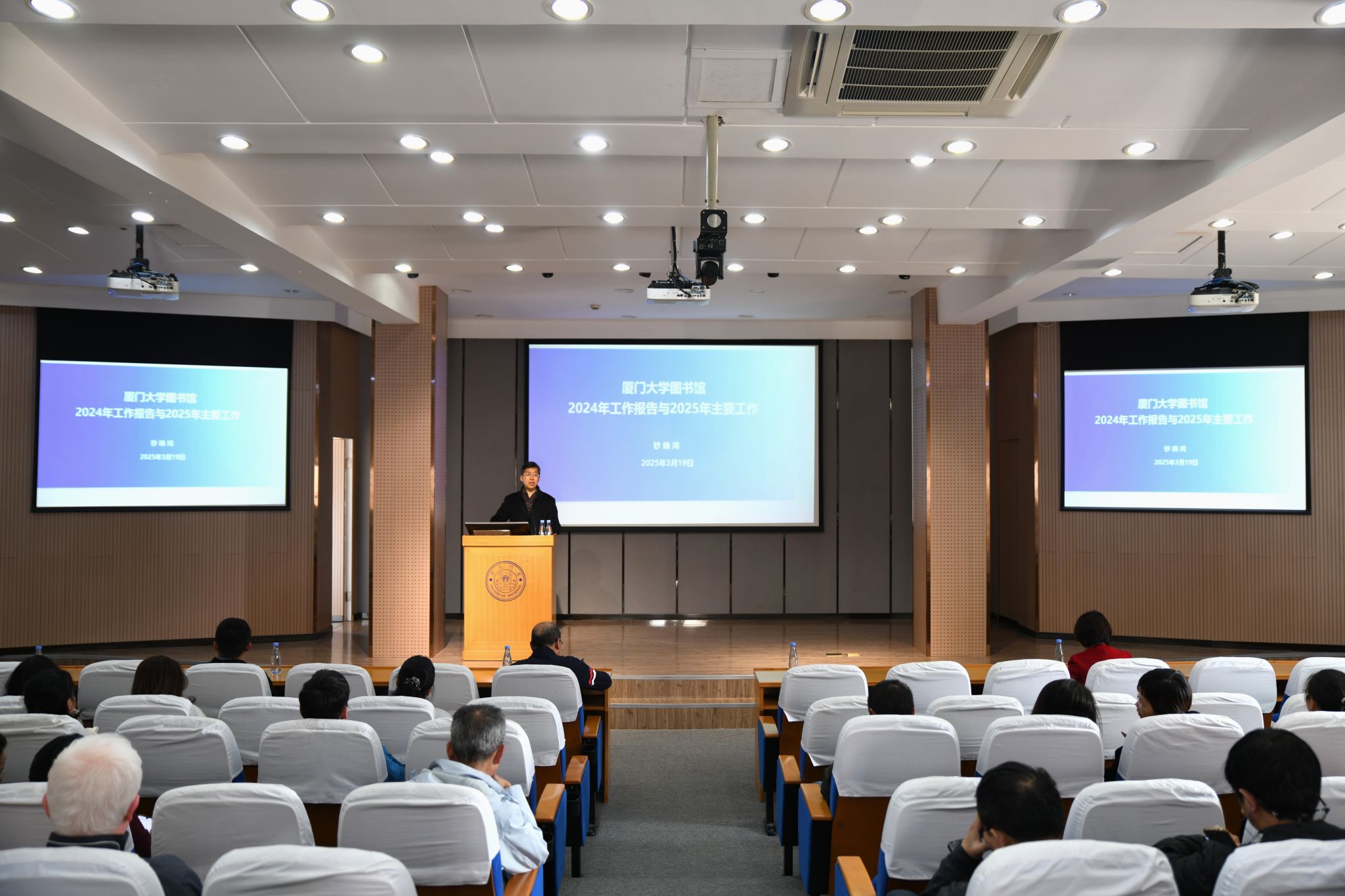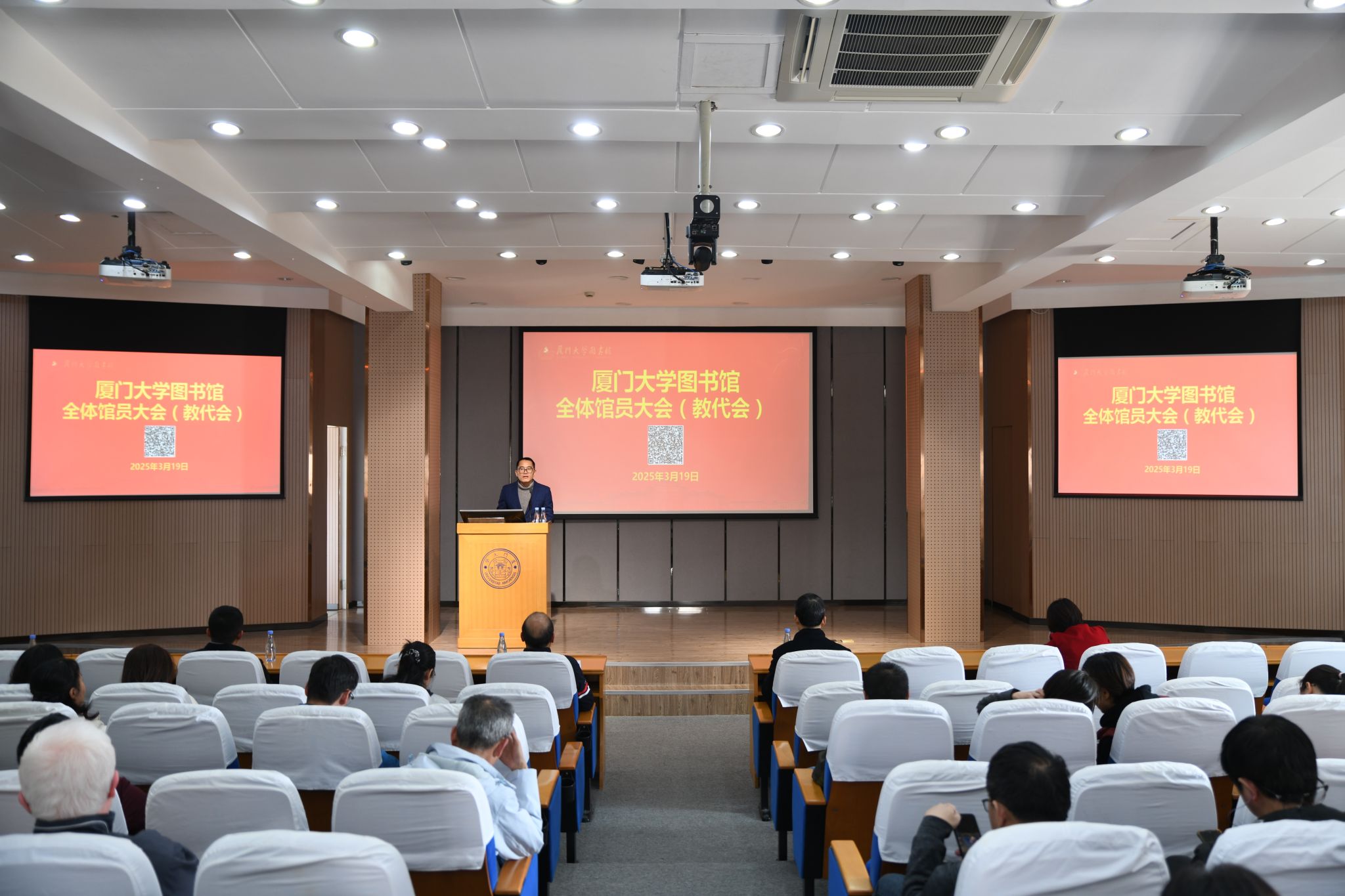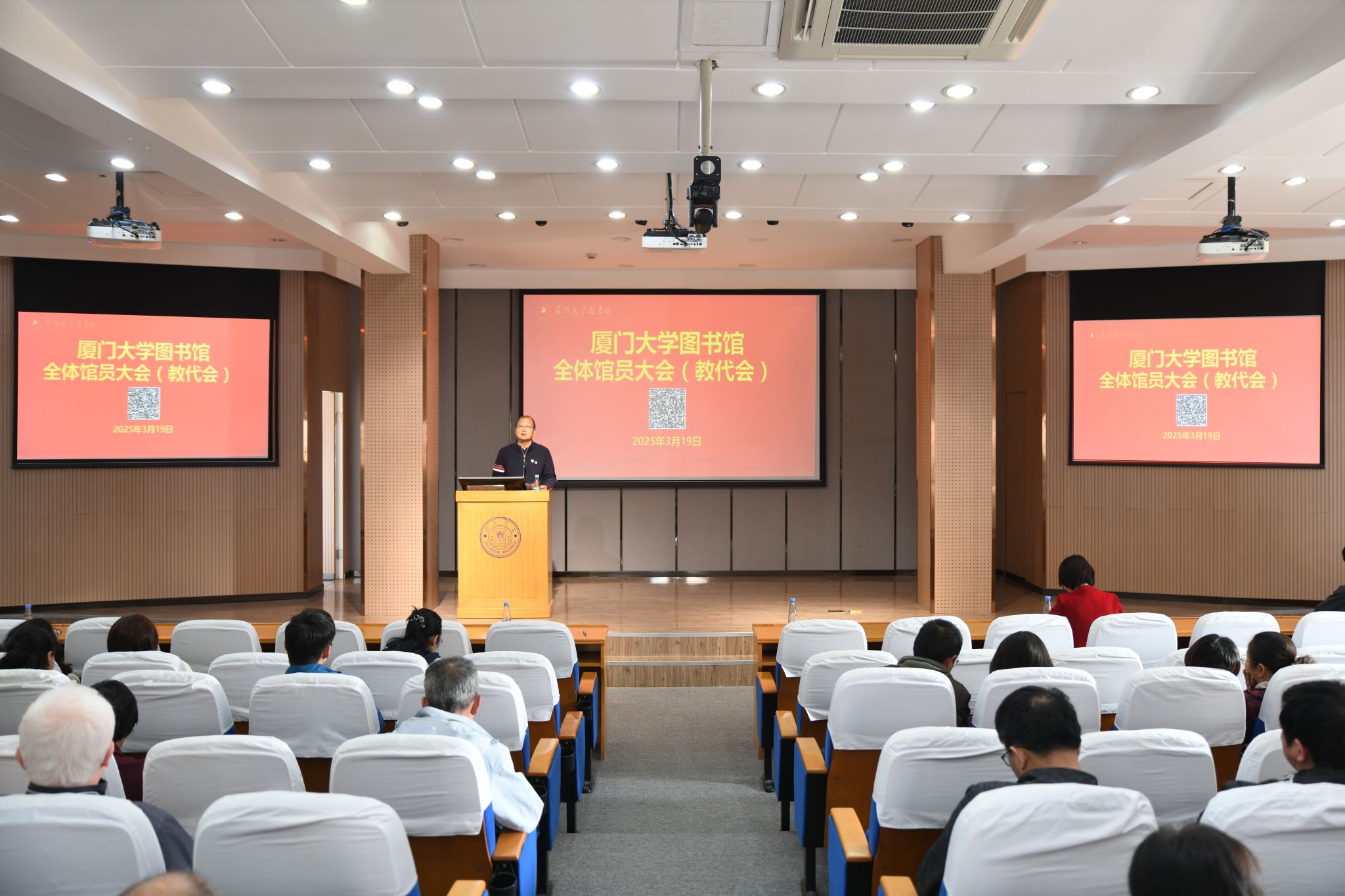 3月19日下午,图书馆全体教职工大会在总馆五楼报告厅举行。馆党政领导班子成员及全体教职工参加会议。会议由馆党委副书记、工会主席陈全松主持。