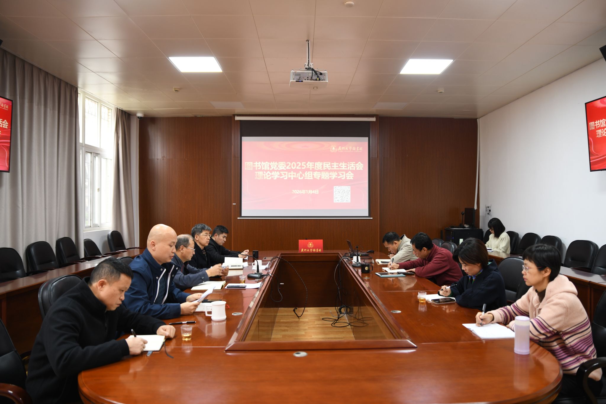 2026年1月4日上午,图书馆党委召开2025年度民主生活会理论学习中心组专题学习会,围绕学习贯彻习近平新时代中国特色社会主义思想和党的二十届四中全会精神,深刻认识作风建设的重要性紧迫性,锲而不舍落实中央八项规定精神,进一步统一思想、凝聚共识,为高质量开好民主生活会打牢思想基础。