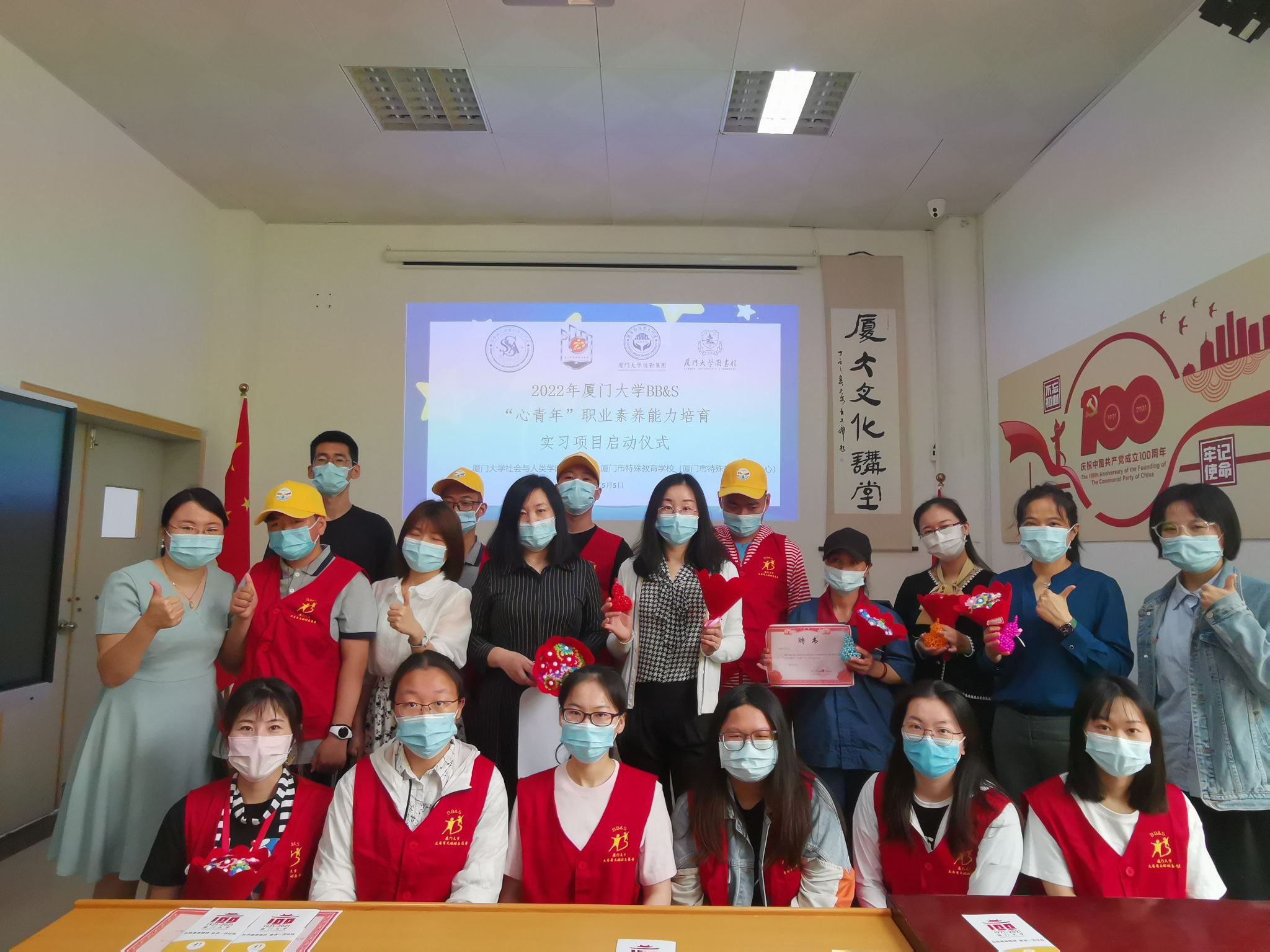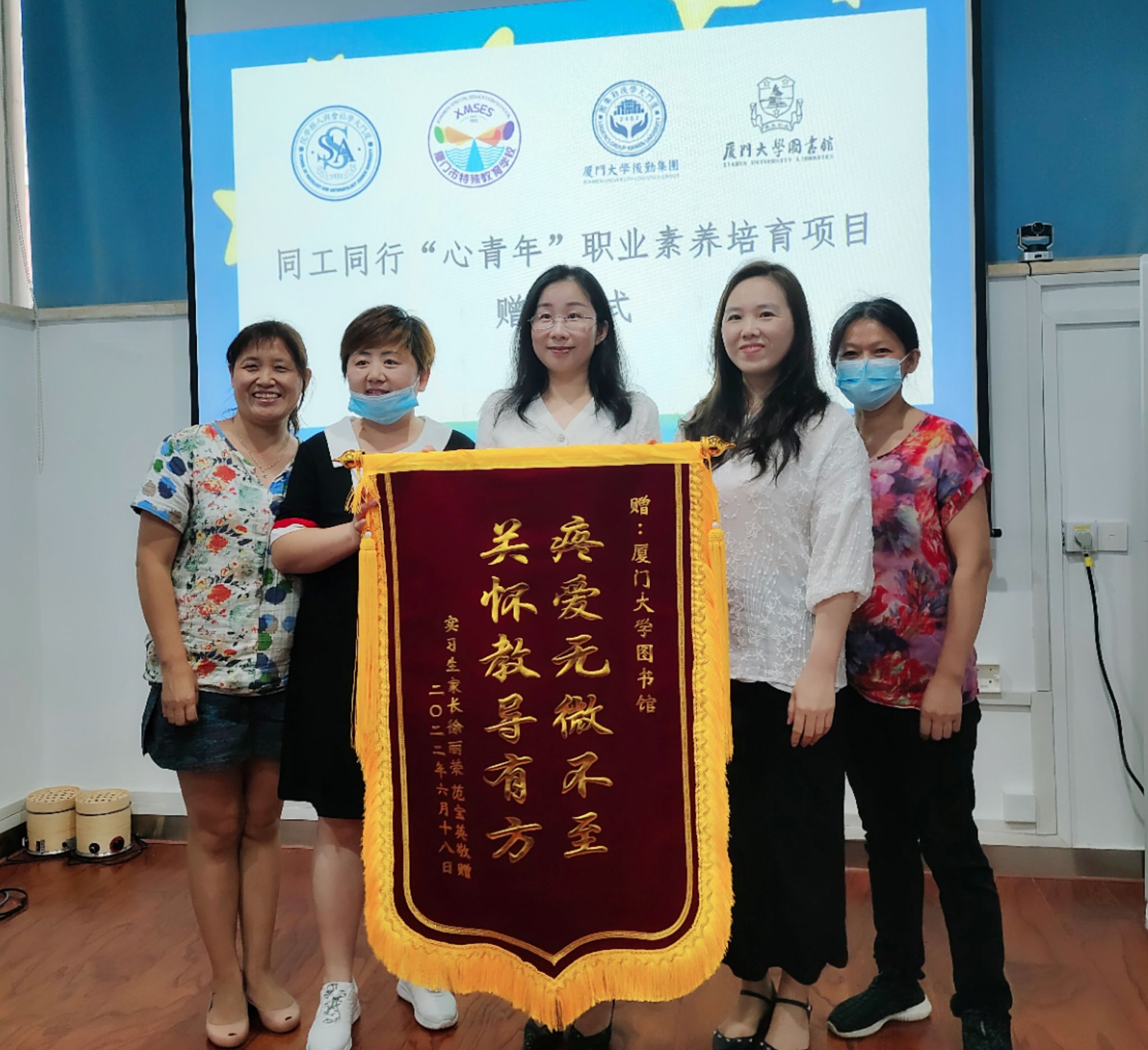 2022年6月21日下午,在厦门大学BB&S同工同行——心智障碍青年(简称“心青年”)职业素养培育实习项目总结座谈会上,实习生家长将一面印有“疼爱无微不至 关怀教导有方”的锦旗赠送给图书馆,以感谢图书馆在“心青年”职业素养培育实习项目中作出的贡献,研究资料部主任王凤英、经济与管理分馆主任邵剑彬出席座谈会并代表图书馆接受锦旗。