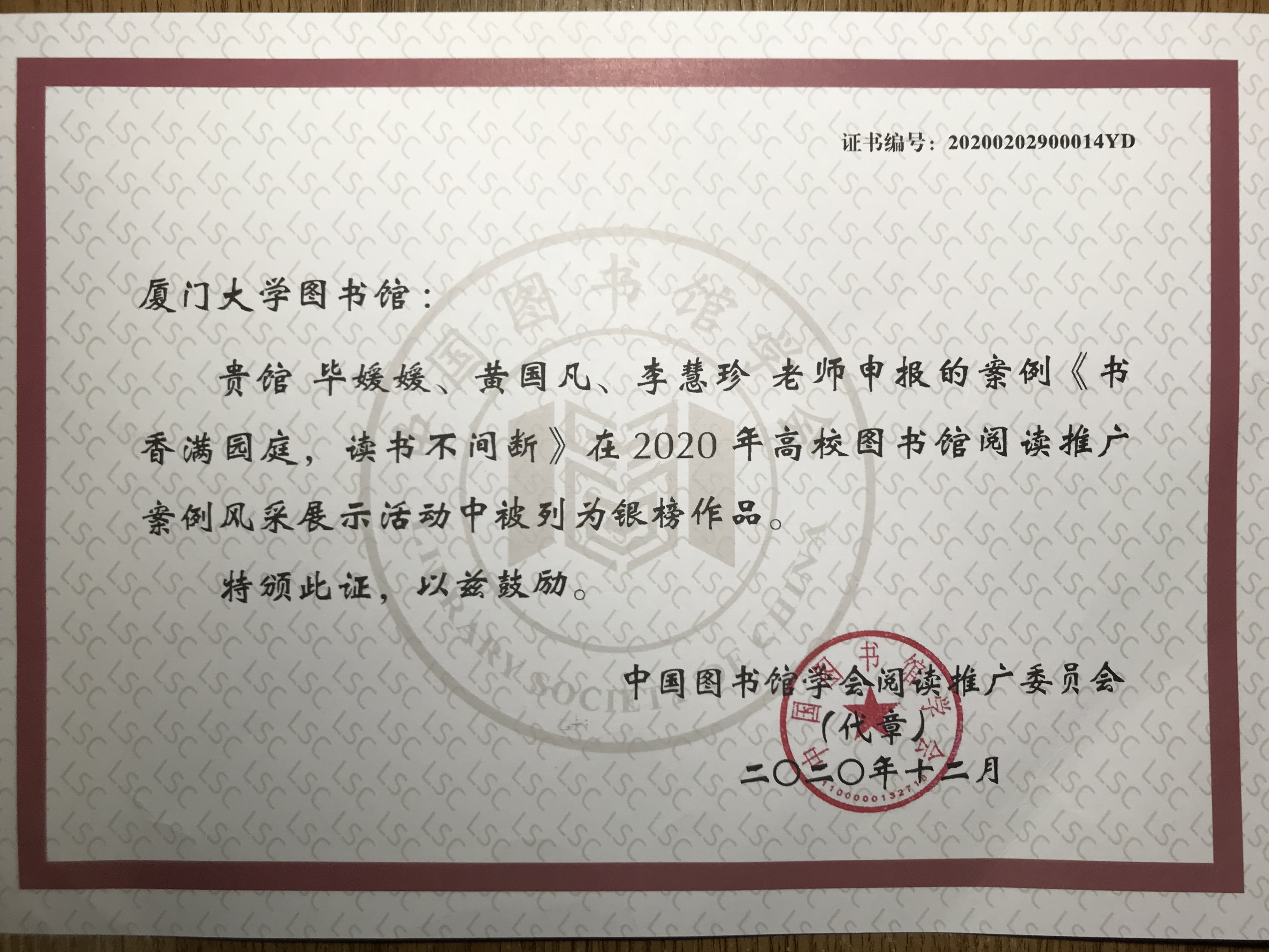 2021年农历春节即将到来,中国图书馆学会传来喜讯。我馆报送的“书香满园庭,读书不间断”案例在2020年“高校图书馆阅读推广案例风采展示活动”中获评为银榜作品。
