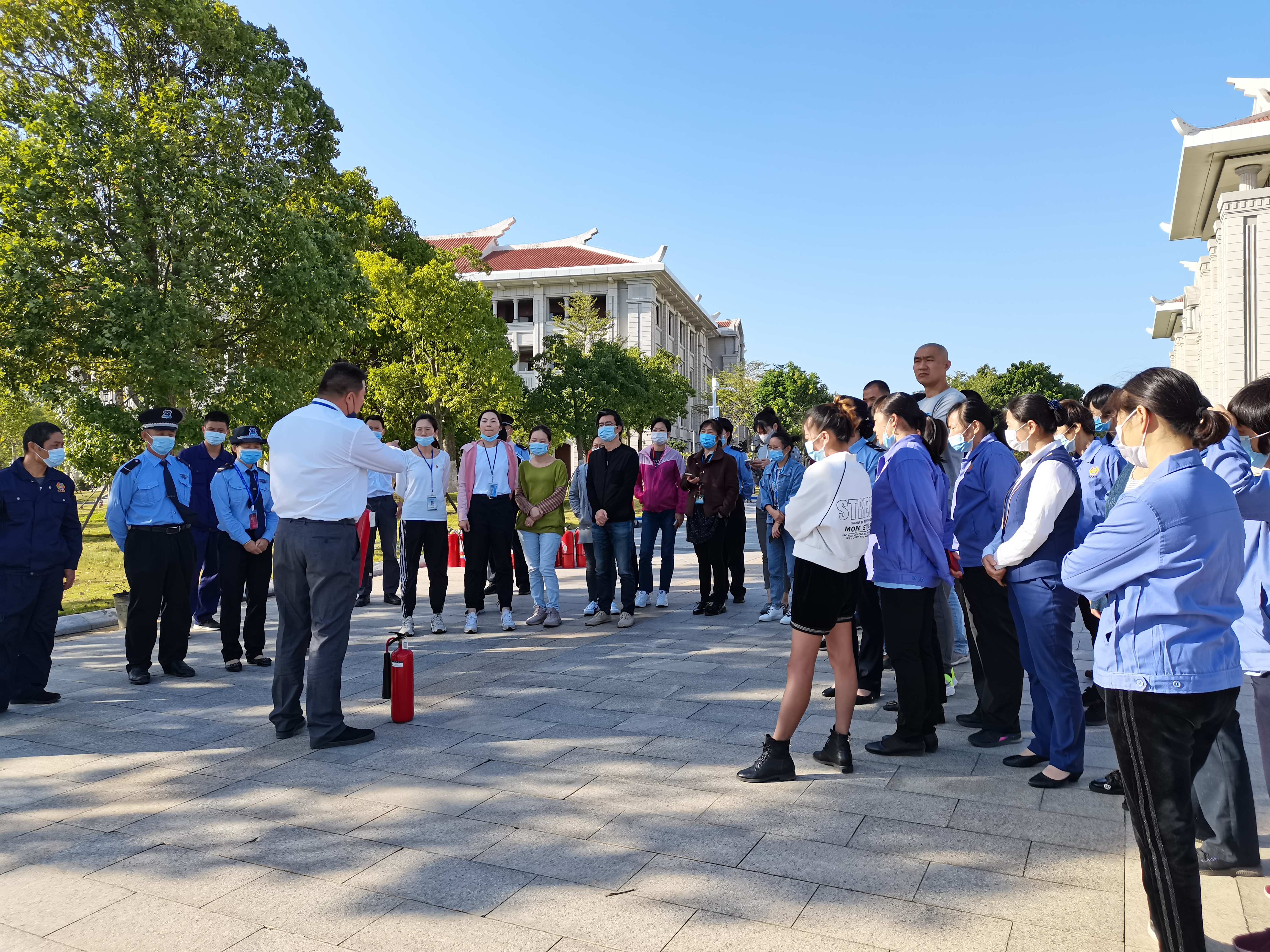 为进一步增强全体馆员的消防安全意识与责任意识,掌握消防器材使用技能,会议结束后全体馆员和物业员工一起进行了灭火器实操演练。物业安全主管陈辉首先对消防安全知识做了全面讲解,着重讲解了火灾的基本常识、火灾防范和隐患排查,介绍了不同火情的处置原则,并演示了灭火器使用方法。随后,德旺馆全体馆员及物业员工依次使用灭火器进行灭火演练。