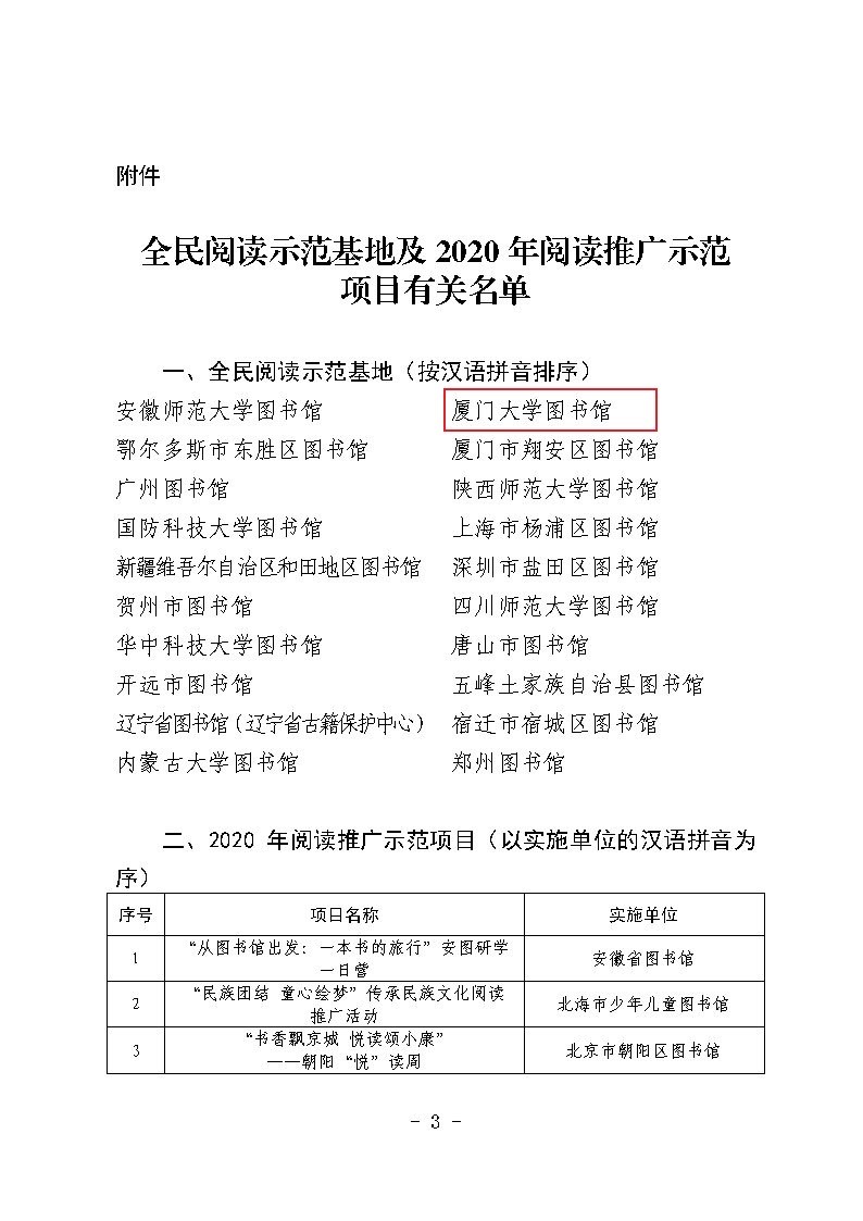 近日,中国图书馆学会向全国相关单位发出通知:厦门大学图书馆等20家图书馆荣获2020年“全民阅读示范基地”。“全民阅读示范基地”是全国图书馆界全民阅读工作的最高荣誉之一,旨在发现和宣传在全民阅读工作中组织得力、成效突出的各级各类图书馆,发挥先进典型的示范带动作用,共同推进学习型社会建设。