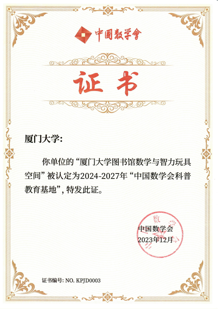 2023年12月23日,中国数学会2023年学术年会在辽宁大连召开。会议为首批入选中国数学会科普教育基地的8个单位授牌,厦门大学图书馆数学与智力玩具空间名列其中。