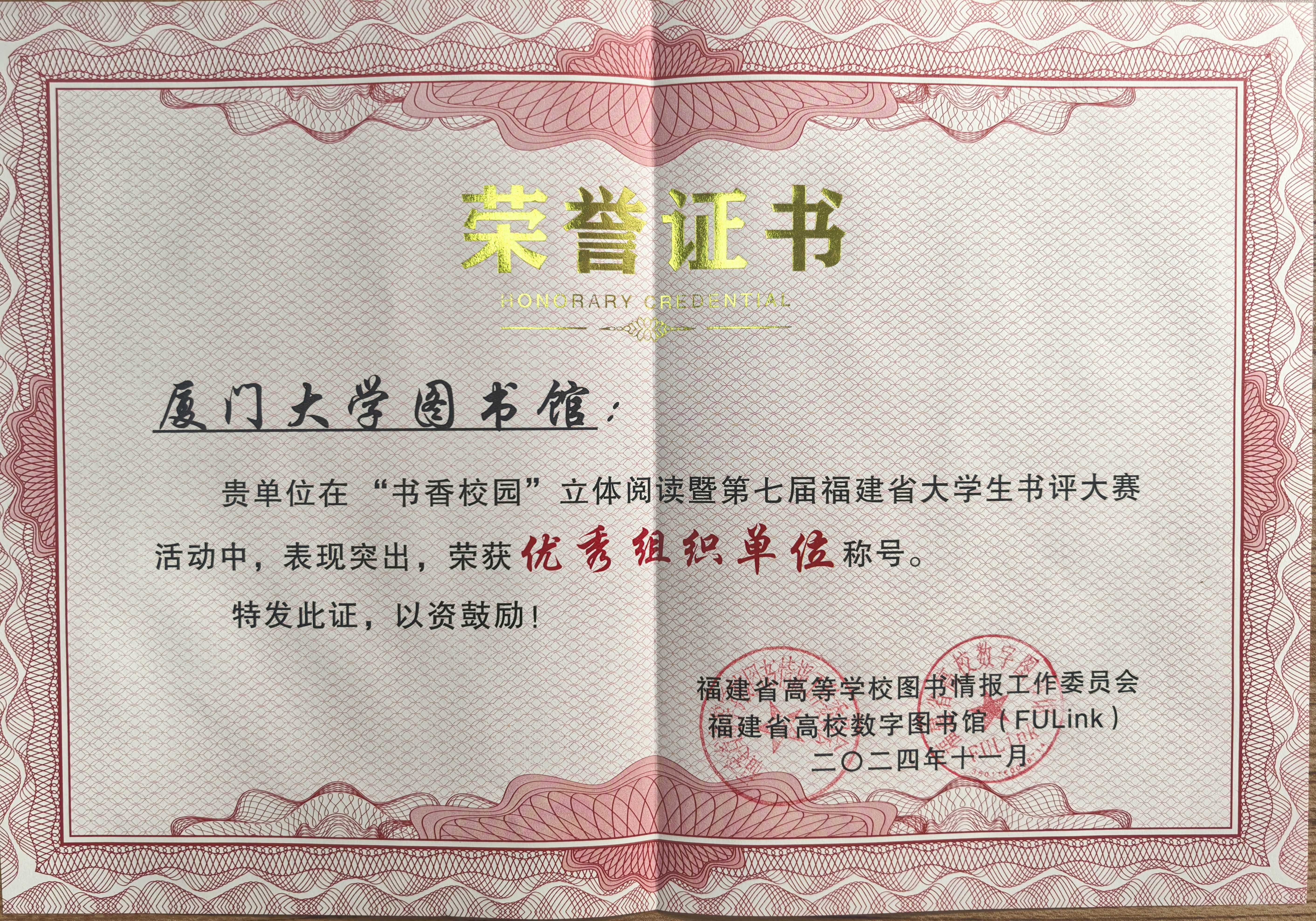 我馆被授予“福建省高校数字图书馆(FULink)2023-2024年度先进集体”荣誉称号。在“书香校园”立体阅读暨第七届福建省大学生书评大赛中,我馆荣获“优秀组织单位”称号。在先进个人评选中,我馆陈和、陈丽娟两位馆员荣获“2023-2024年度先进工作者”称号。
