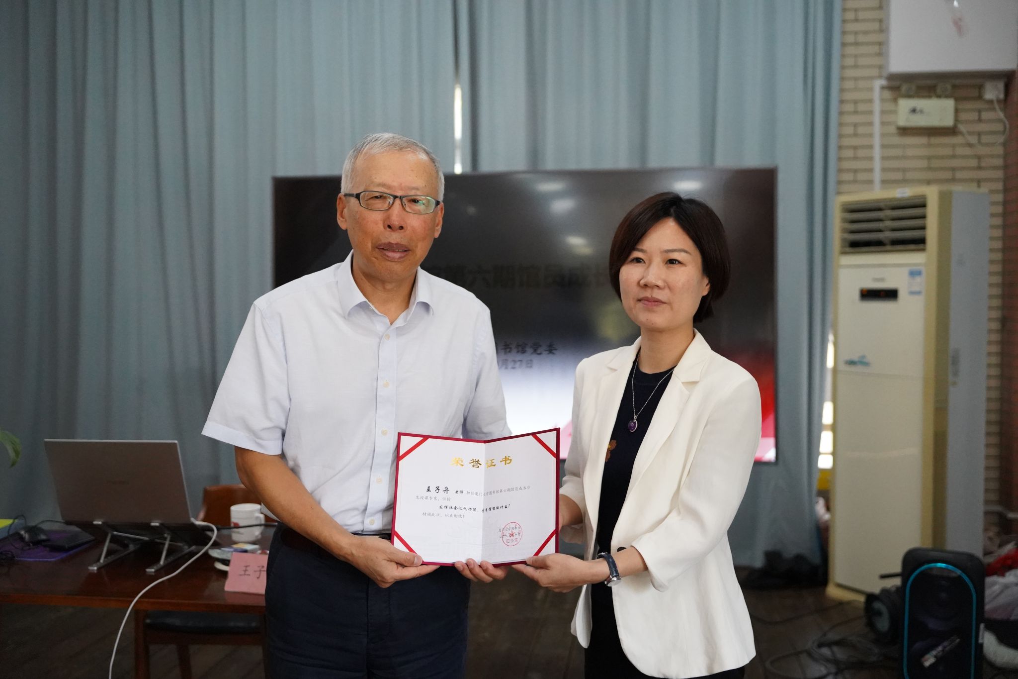 最后,由陈娟为王子舟教授颁发馆员成长沙龙讲座纪念证书。