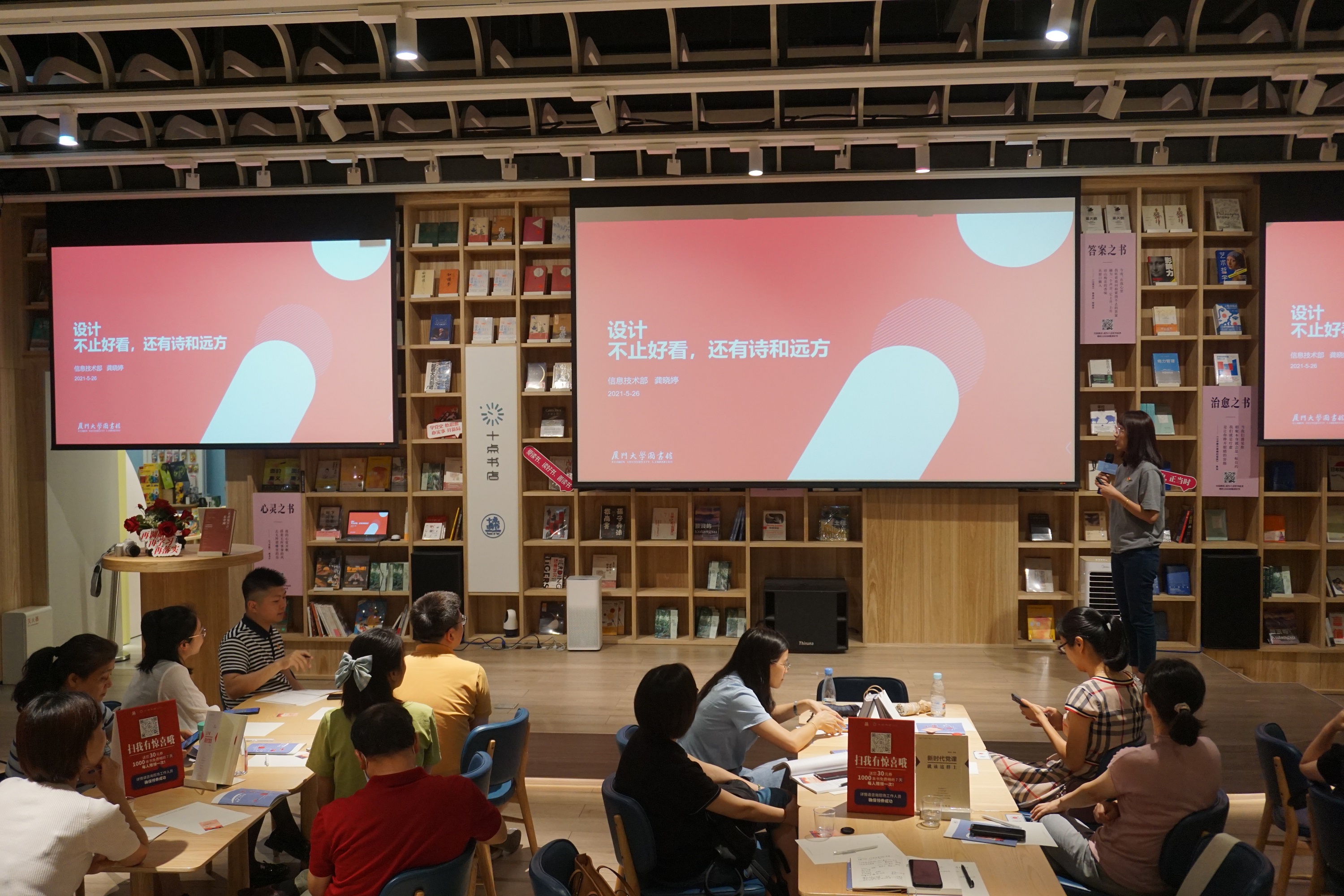 图书馆行政技术党支部龚晓婷分享了《设计 不止好看,还有诗和远方》报告。她分析了图书馆设计与日常设计的不同,并从Attractive、Clear、Emotional、Interesting、Update五个方面介绍了在图书馆中设计工作需要注意的事项,通过圕时光、Library·Go、每周一签等设计案例,展现了厦大图书馆在设计过程中从读者的角度出发,在推广服务的同时,不断找寻与读者的连接点,让冰冷的数据在设计中生动化。