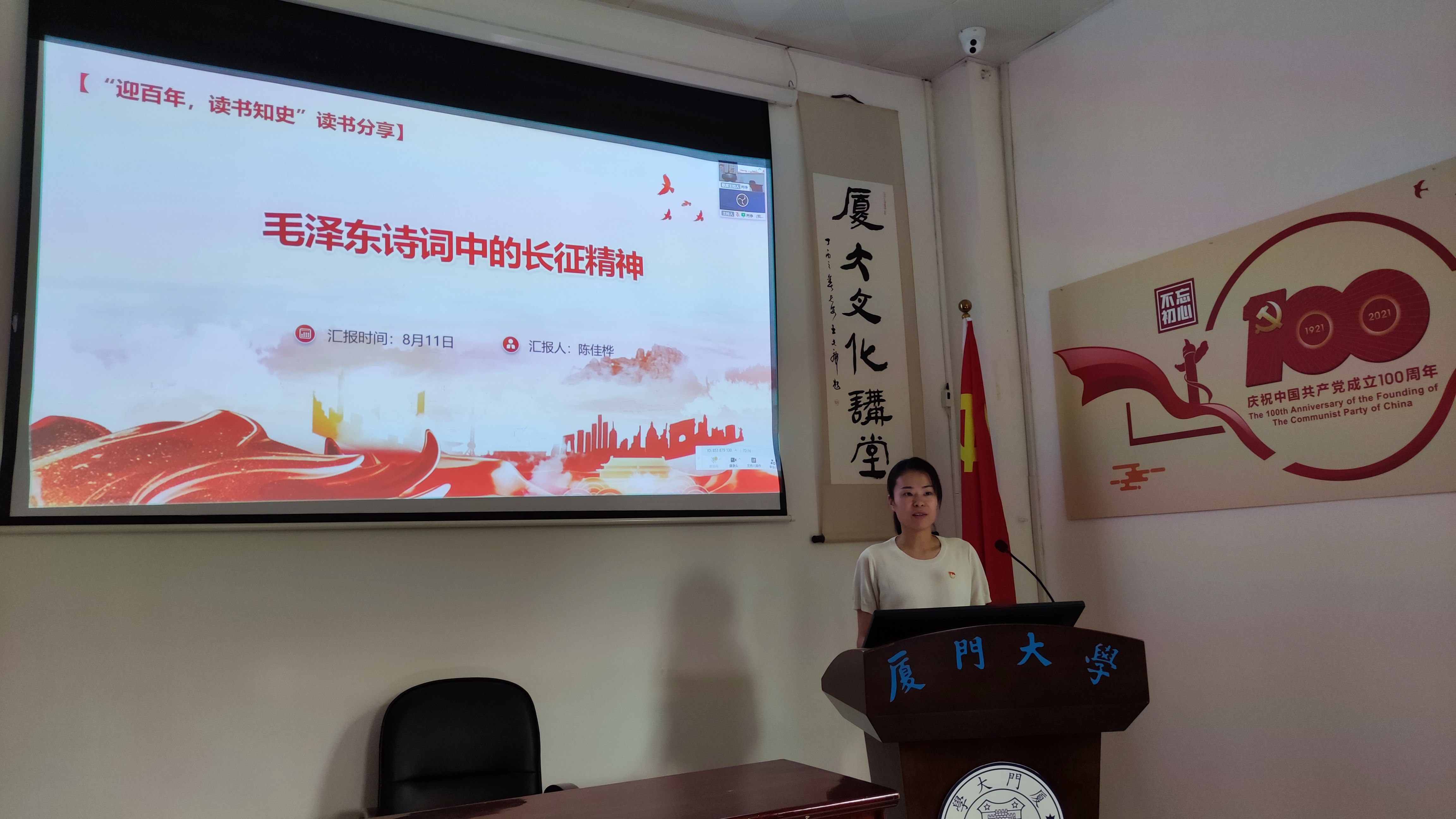 支部在党史学习教育开展初期,就将读书报告微党课作为学习的主要形式之一。在前期主题党日活动中,已有党员就《论中国共产党历史》、嘉庚精神与中国共产党、延安精神分享了各自的学习体会。本次活动,支部党员龚晓婷和陈佳桦分别分享了有关特区精神和长征精神的学习心得。