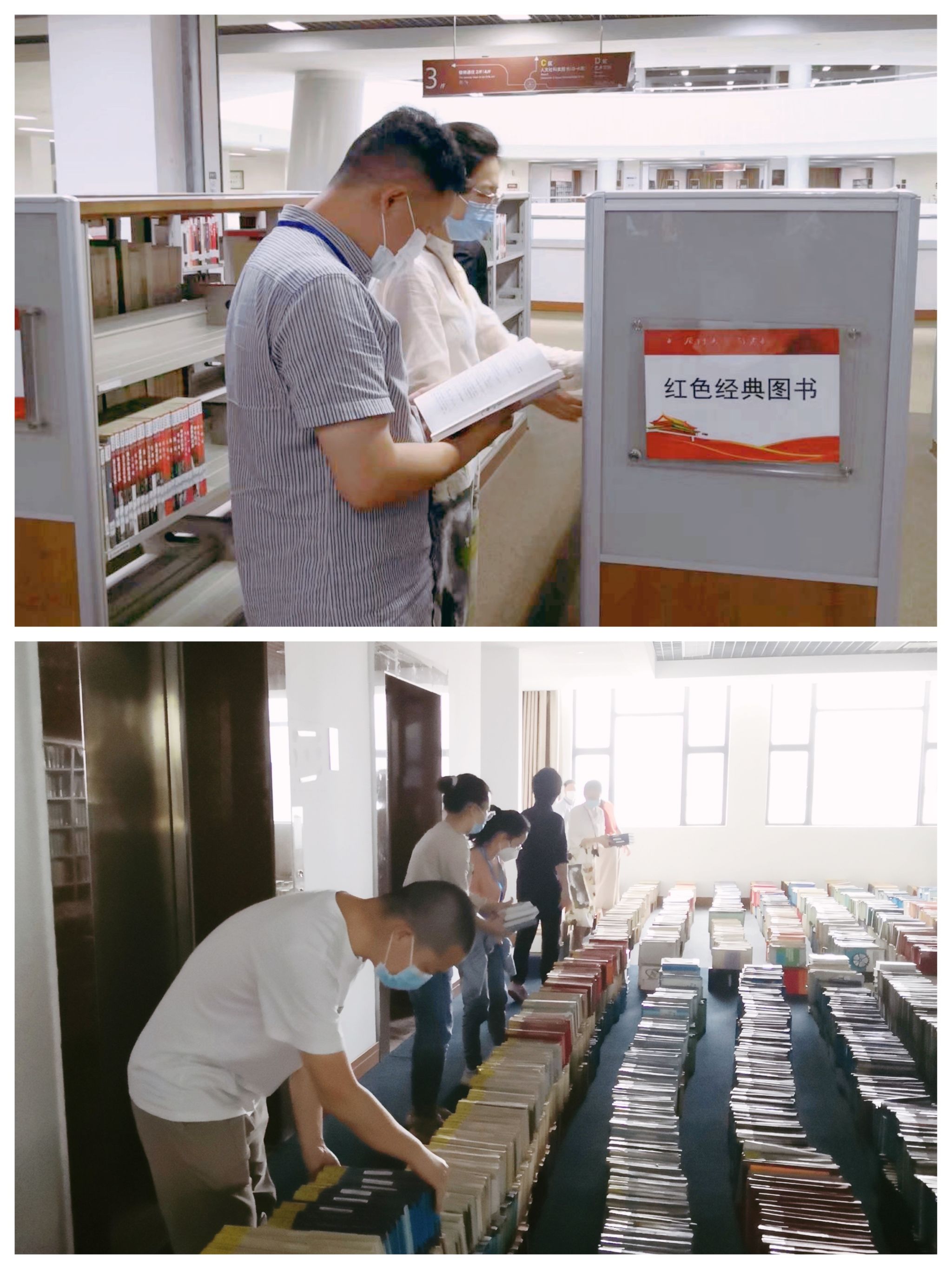 随后,支部党员移步德旺图书馆7楼,整理搬运待编目的外文书籍,方便后续进行馆藏调整。这些书籍大多为期刊合订本,体积大,书籍摆放密度高,可供人员搬动的空间较小。支部党员积极开动脑筋,充分利用身高体型,以“人工传送带”的模式提高搬运工作效率。劳动持续了近两个小时,大家虽然满身是汗,但看到整整齐齐的书,还是很有收获感,也体会到了劳动的快乐。