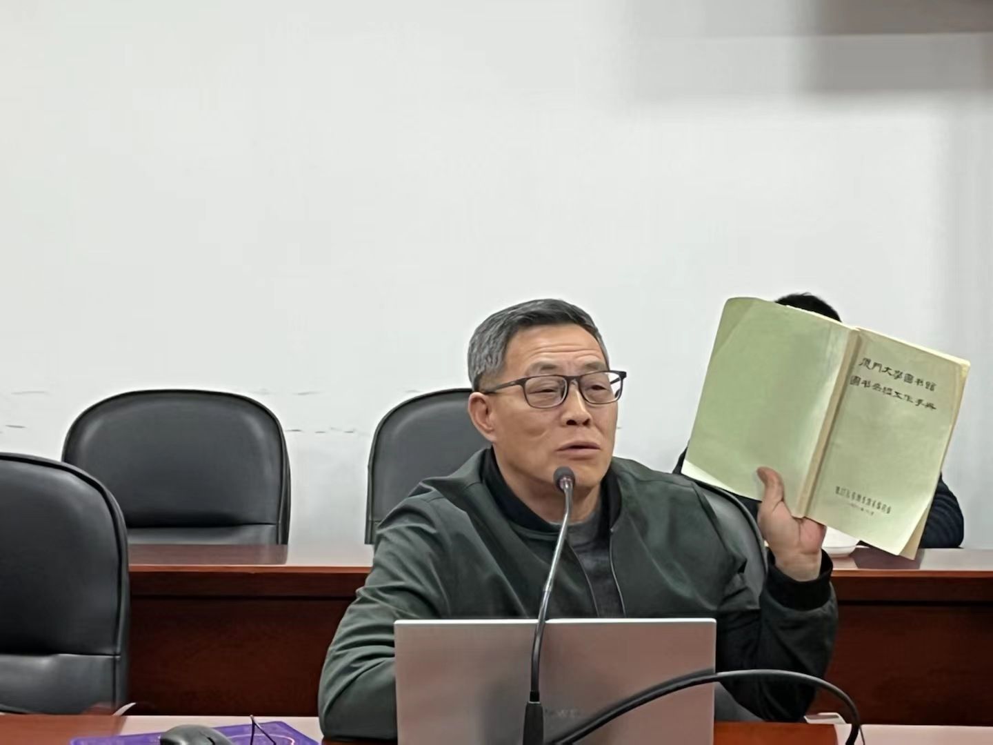 肖德洪同志从一本一九八一年印制的《厦门大学图书采编工作手册》中的卡片目录、文献著录规则讲起,回顾了四十年以来图书馆采编业务的足迹。随后,他援引论著,重申“收藏整体化、保存多样化”这一文献资源建设的基本原则,并结合图书馆现有馆藏,分享了自己对厦大地方研究特色馆藏的思考。通过典型案例进一步说明收藏整体化、保存多样化的具体举措以及重要意义。