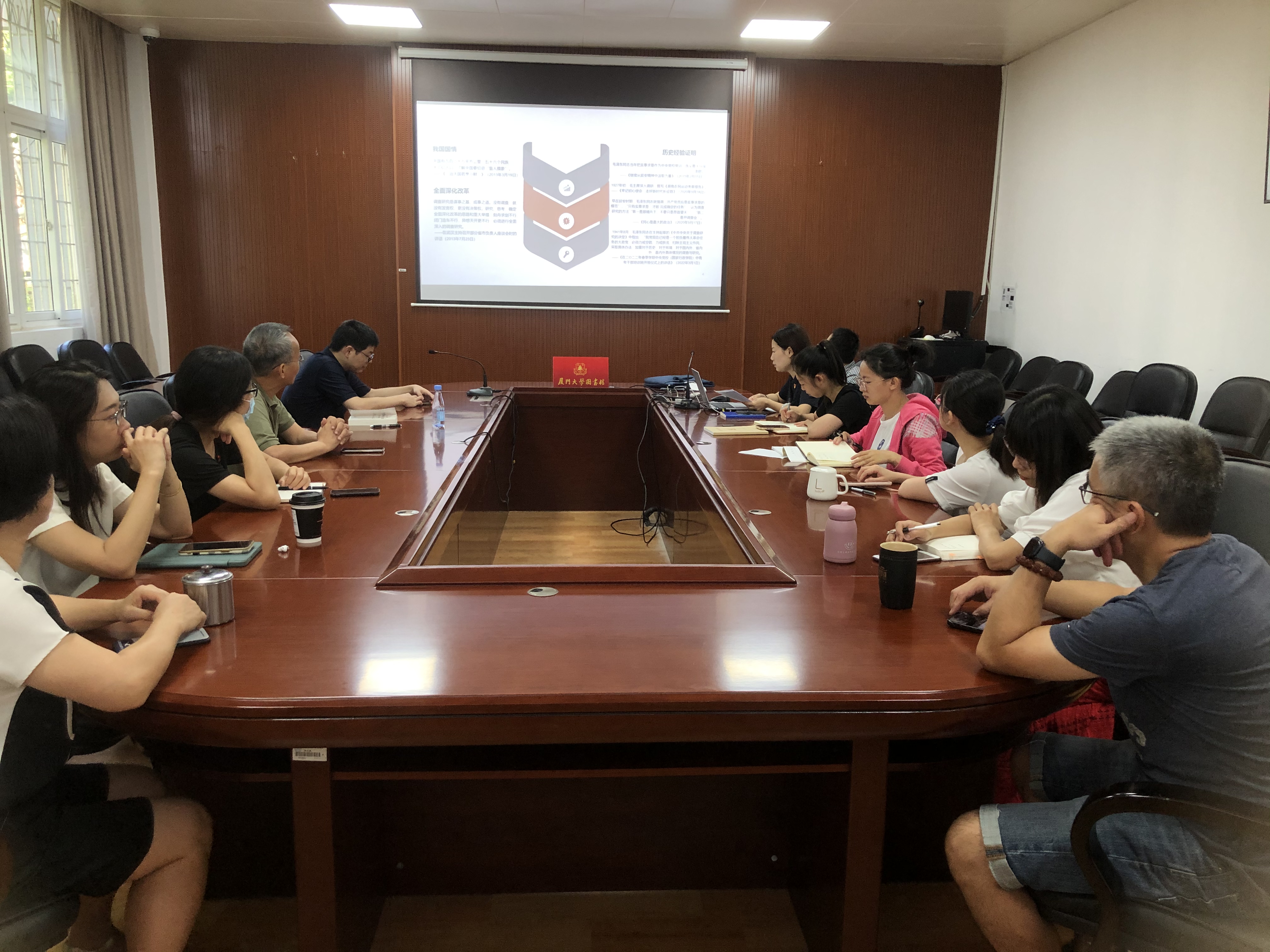 2023年7月6日上午,行政技术党支部在图书馆总馆一楼会议室开展学习贯彻习近平新时代中国特色社会主义思想主题教育第四次集中学习交流。活动由党支部书记林俊伟主持,联系支部的党委委员、副馆长陈娟和支部党员邵碧珠领学,办公室和信息技术部全体党员和群众一起参加了本次学习。