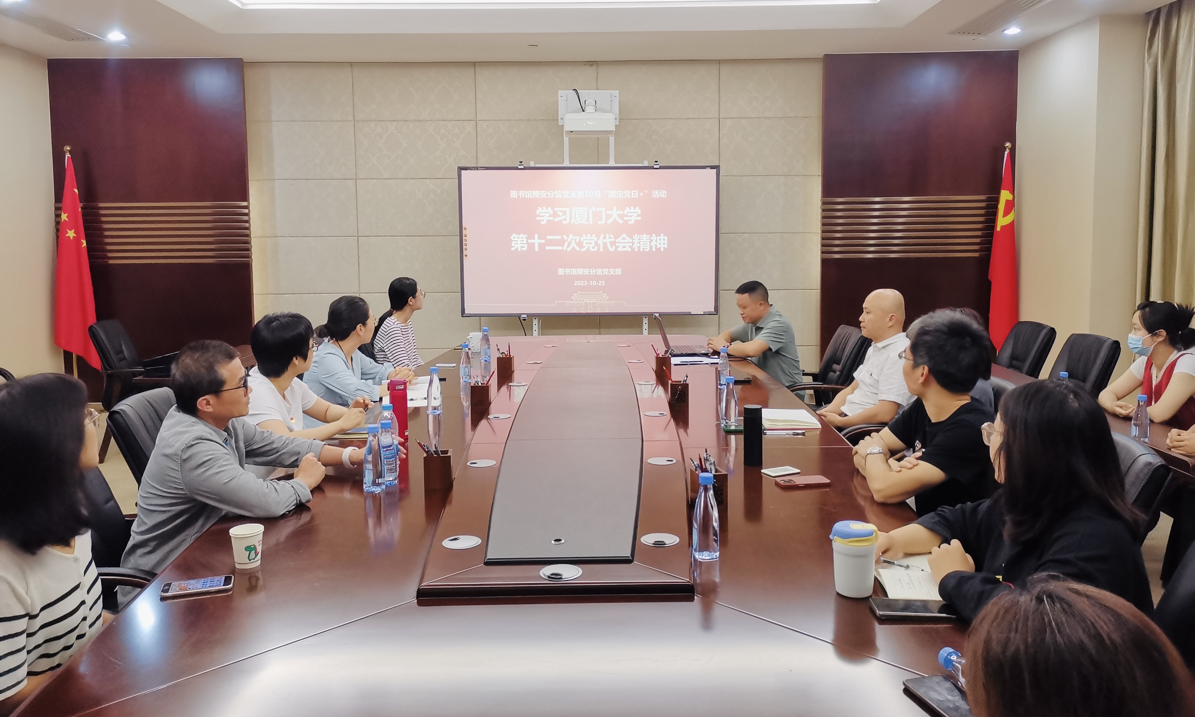 2023年10月25日下午,翔安分馆党支部在德旺图书馆二楼会议室开展主题为“学习厦门大学第十二次党代会精神”的“固定党日+”活动。活动由支部书记谢明诠主持,德旺图书馆全体党员和馆员参加学习。