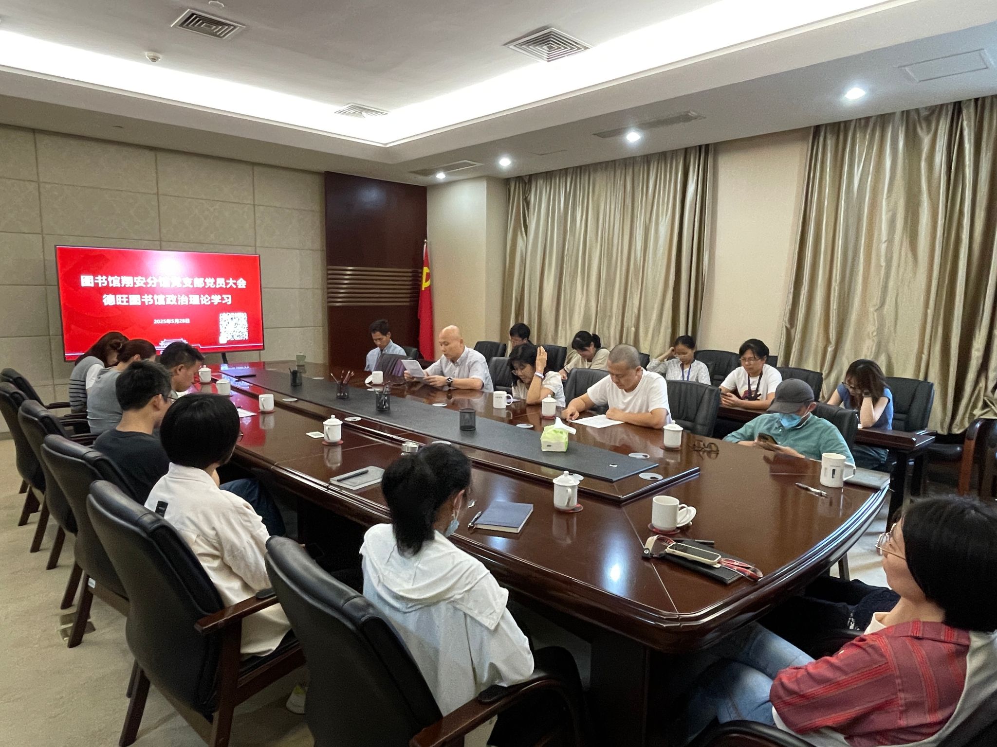 2025年5月28日下午,翔安分馆党支部在德旺图书馆二楼会议室召开党员大会,围绕全校师生党员第二次集中培训开展交流研讨,并安排部门政治理论学习。会议由支部书记谢明诠主持,德旺图书馆全体馆员参会。