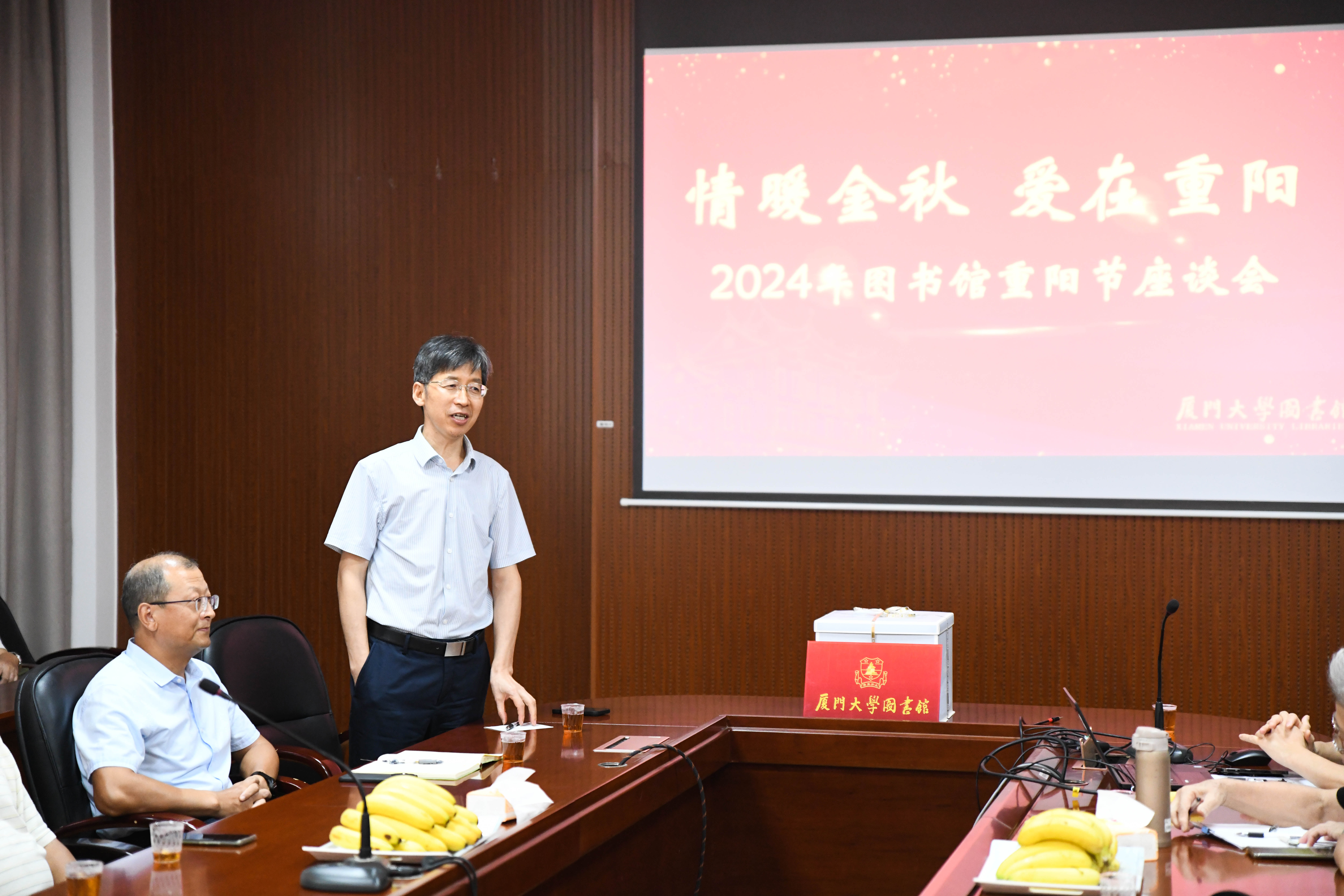接着,杜海林为在座老同志送上了重阳节祝福。他强调,老同志们不仅为图书馆的建设奠定了坚实的基础,而且在退休后仍然以各种形式支持图书馆的工作,为图书馆事业的发展贡献着宝贵的经验和智慧。他满怀深情地朗诵了毛泽东主席的诗词《采桑子·重阳》,以此表达对老同志们的感谢和深深的祝福。