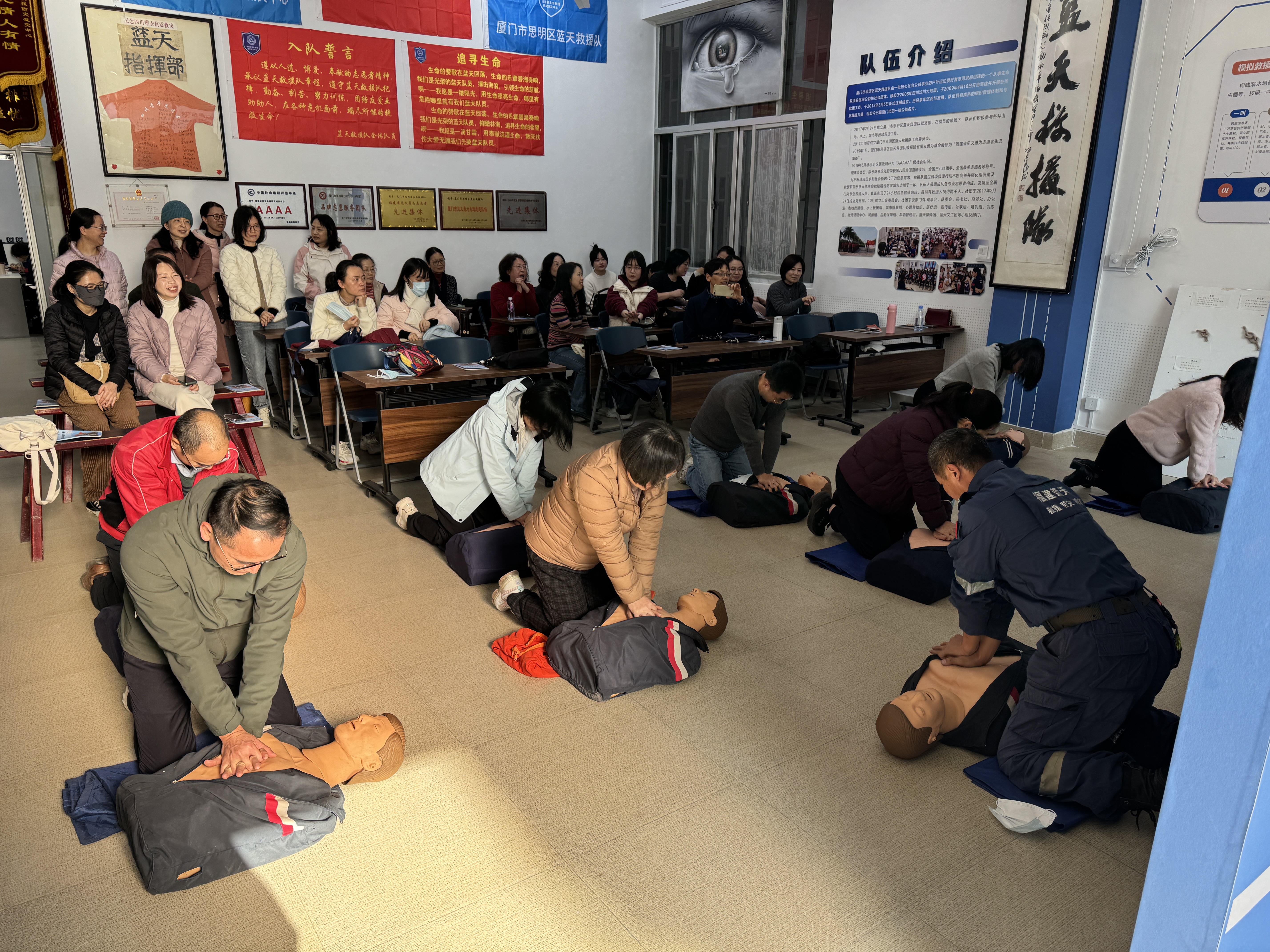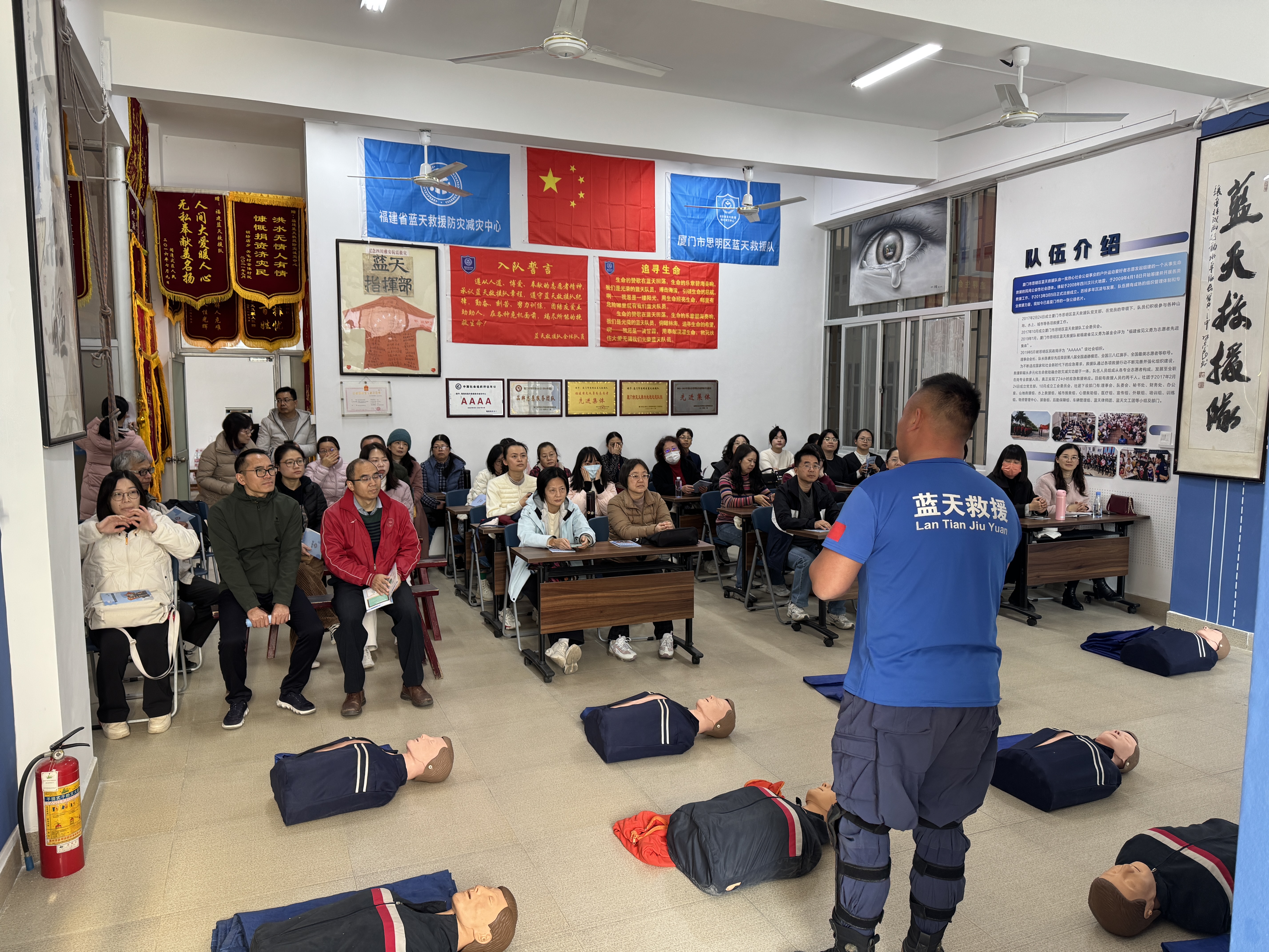 本次培训,思明区蓝天救援队安排资深培训导师进行授课,培训内容涵盖意外伤害处理、心肺复苏(CPR)、海姆立克急救法、自动体外除颤器(AED)的使用等多项关键急救技能。馆员们全神贯注地聆听,踊跃参与体验,现场互动频繁,学习氛围热烈。