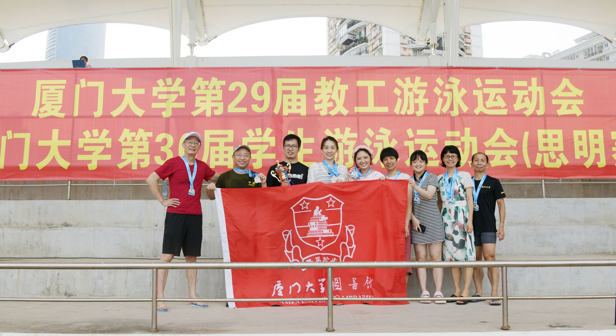 6月19日,厦门大学第29届教职工游泳运动会在王清明游泳馆举行,图书馆代表队荣获团体总分第二名。