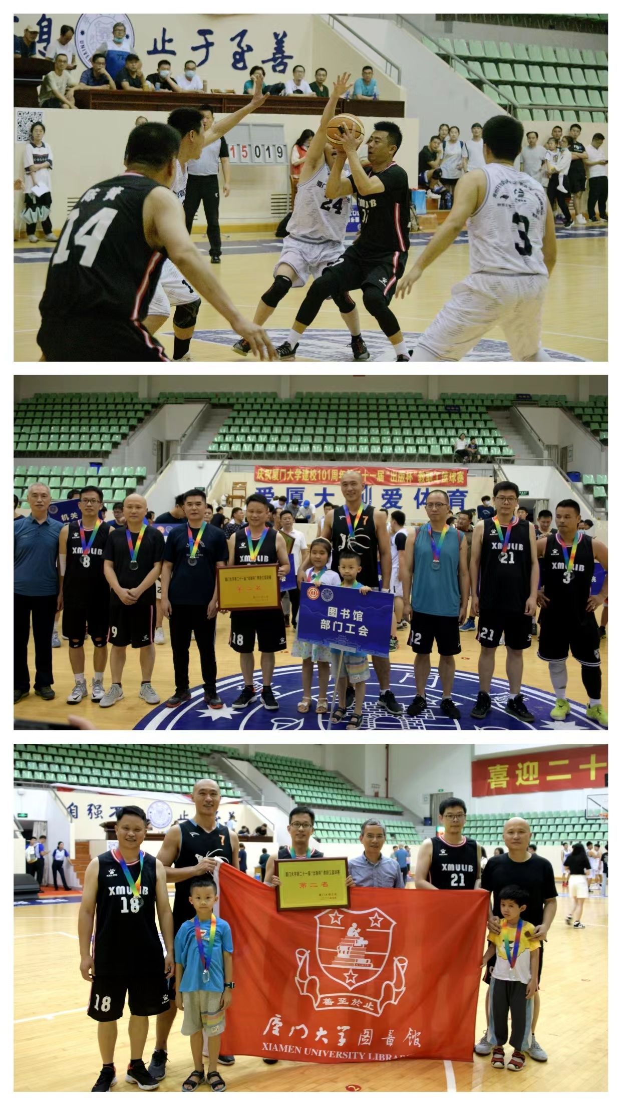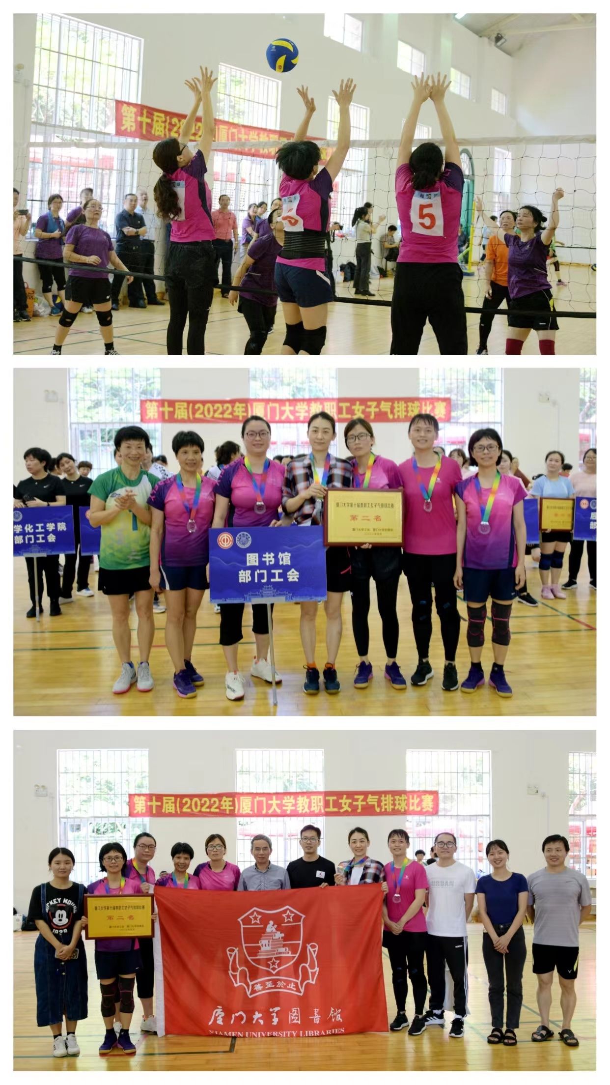 5月29日上午和晚上,我馆教职工女子气排球队和男子篮球队先后在厦门大学第十届教职工女子气排球赛决赛和第二十一届“出版杯”教职工篮球赛决赛中憾负对手,荣获亚军。